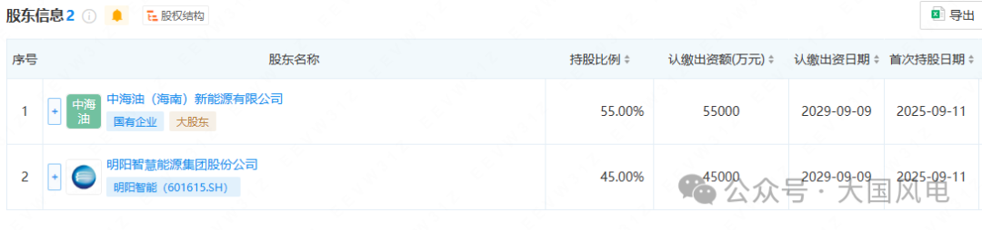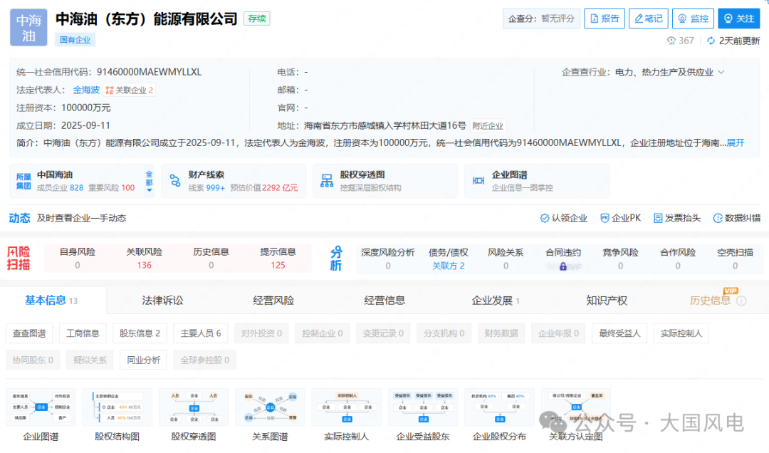 9月11日,中海油(東方)能源有限公司成立,法定代表人為金海波,注冊資本10億人民幣,經營范圍包括發電技術服務、太陽能發電技術服務、風力發電技術服務等。股東信息顯示,該公司由中海油(海南)新能源有限公司(55%)、明陽智能(45%)共同持股。中海油(東方)能源有限公司注冊成立于海南省東方市,據了解,中海油目前正在推進海南CZ7海上風電示范項目建設,該項目位于海南省東方市西側海域,規劃裝機容量為1500MW,分兩期建設。其中,一期工程(CZ7-1)場址中心離岸距離約29km,場址面積約60km2,水深位于11m~44m之間,規劃裝機總容量為600MW;二期工程(CZ7-2)場址中心離岸距離約38km,場址面積約126km2,水深位于26~49m之間,裝機容量為900MW。