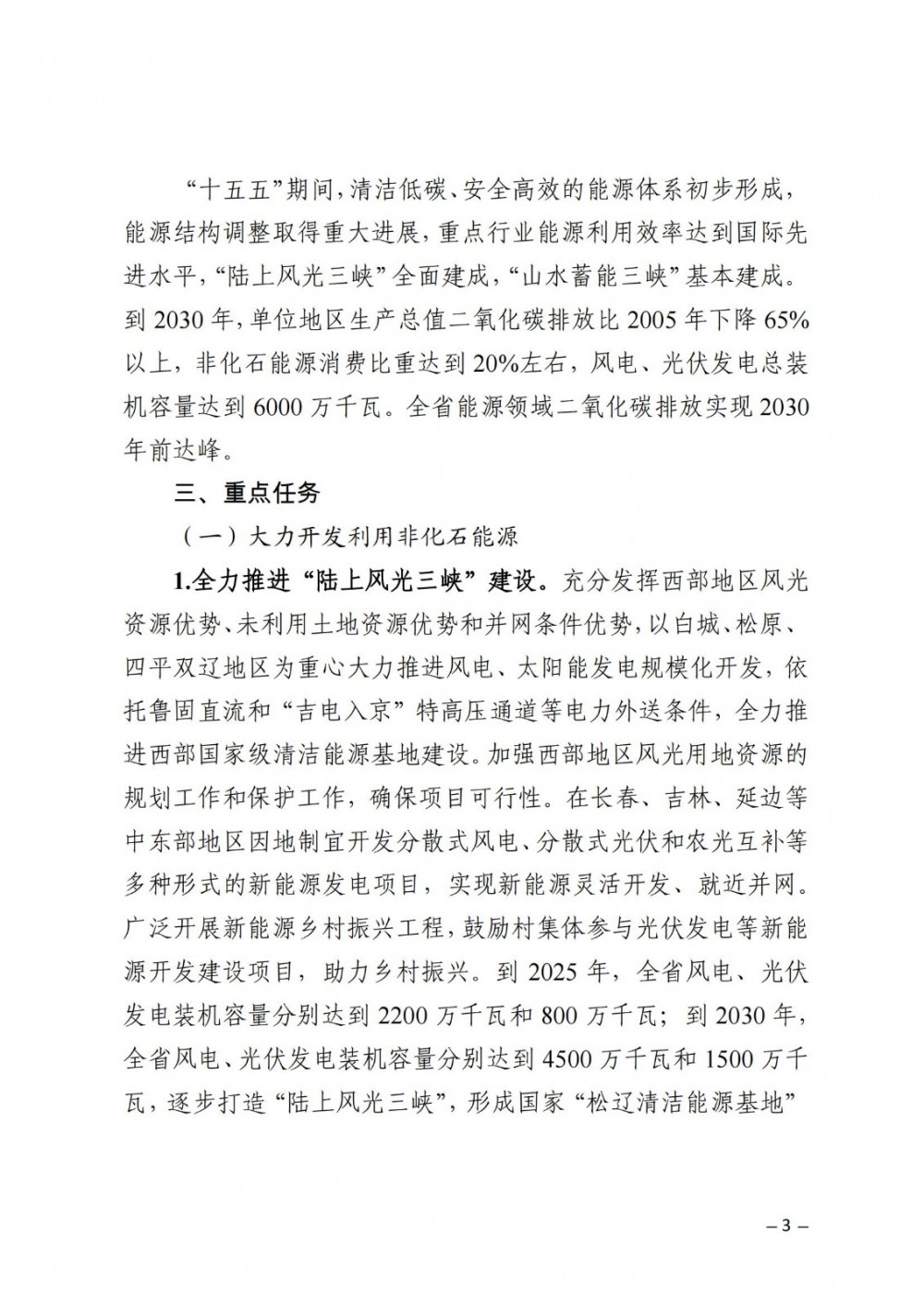 到2025年,全省風電、光伏發電裝機容量分別達到2200萬千瓦和800萬千瓦;到2030年,全省風電、光伏發電裝機容量分別達到4500萬千瓦和1500萬千瓦,逐步打造“陸上風光三峽”,形成國家“松遼清潔能源基地”核心組成部分。