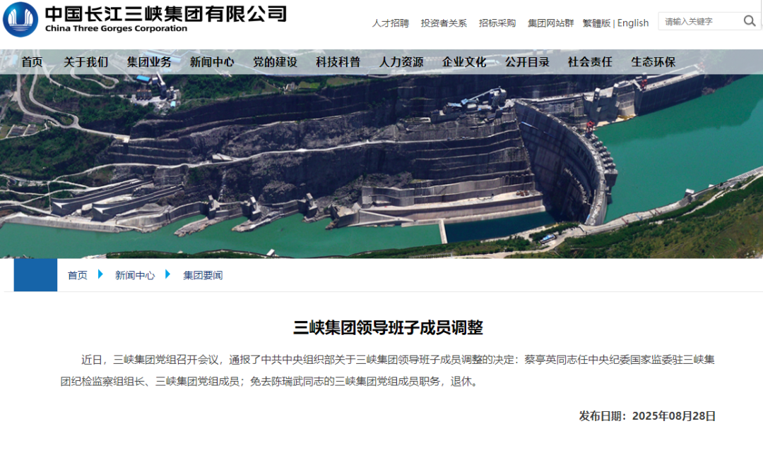 據(jù)三峽集團(tuán)官方網(wǎng)站8月28日消息  近日,三峽集團(tuán)黨組召開會議,通報(bào)了中共中央組織部關(guān)于三峽集團(tuán)領(lǐng)導(dǎo)班子成員調(diào)整的決定:蔡亭英同志任中央紀(jì)委國家監(jiān)委駐三峽集團(tuán)紀(jì)檢監(jiān)察組組長、三峽集團(tuán)黨組成員;免去陳瑞武同志的三峽集團(tuán)黨組成員職務(wù),退休。