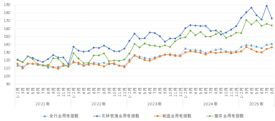 8月,農林牧漁業用電指數為173.0,比2020年基期增長了73.0%,年均增長11.6%,同比增長9.7%。