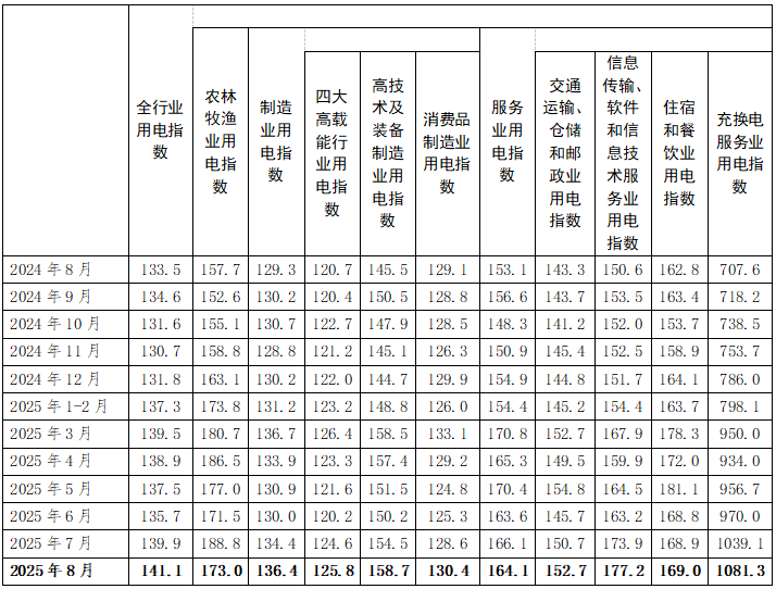 2025年8月,全國全行業用電指數為141.1,全行業用電量比2020年基期(以2020年基期為100)增長了41.1%,年均增長7.1%,同比增長5.6%,增速比上月回落0.8個百分點。