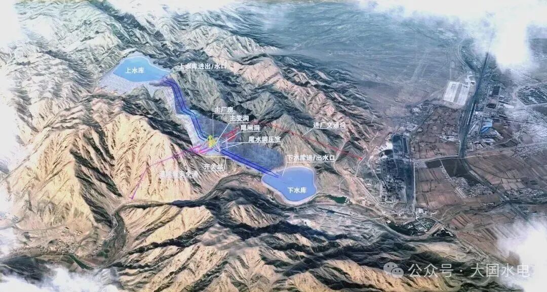 永昌抽水蓄能電站項目總裝機容量120萬千瓦,安裝4臺單機容量30萬千瓦的立軸單級混流可逆式水泵水輪機組,設計滿發利用小時數為5小時,年發電量11.69億千瓦時,年抽水用電量15.59億千瓦時,綜合效率75%。永昌抽水蓄能電站項目為一等大(1)型工程,樞紐由上水庫、輸水系統、地下廠房及下水庫組成。上水庫位于金川峽水庫下游1公里,下水庫毗鄰韓家峽水庫下游1.5公里,利用天然地形高差實現能量存儲。輸水系統總長度2184.44米,壓力鋼管采用高強度鋼板焊接工藝,最大靜水頭502米。