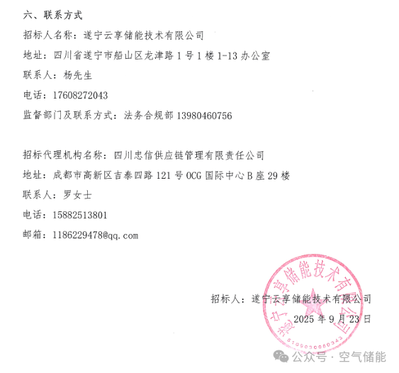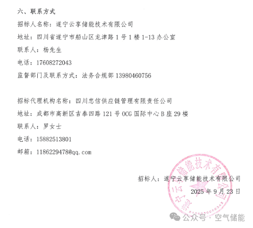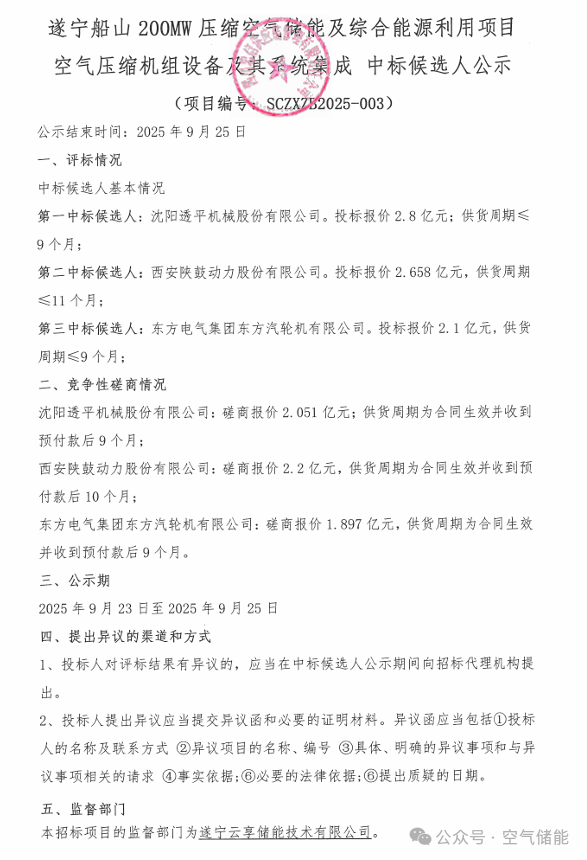 9月23日,遂寧船山200MW壓縮空氣儲能及綜合能源利用項目空氣壓縮機組設備及其集成系統(tǒng)采購中標候選人公示。