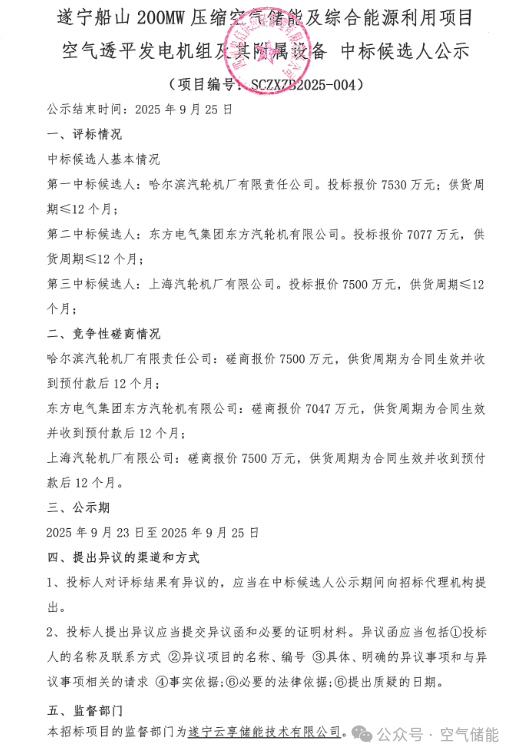 遂寧船山200MW壓縮空氣儲能及綜合能源利用項目空氣透平發(fā)電機組及其附屬設備采購中標候選人公示