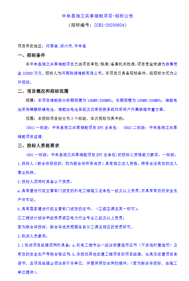 9月26日,河南勝源儲(chǔ)能有限公司發(fā)布中牟縣獨(dú)立共享儲(chǔ)能項(xiàng)目招標(biāo)公告。項(xiàng)目位于河南省鄭州市中牟縣,本項(xiàng)目?jī)?chǔ)能部分終期規(guī)模為100MW/200MWh,本期規(guī)模為100MW/200MWh,儲(chǔ)能電池采用磷酸鐵鋰電池,儲(chǔ)能站電池系統(tǒng)及功率變換系統(tǒng)均采用戶外集裝箱布置方案。范圍:本招標(biāo)項(xiàng)目劃分為2個(gè)標(biāo)段,本次招標(biāo)為其中的: