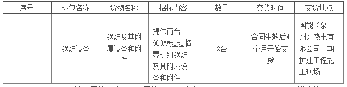 項目包括國能(泉州)熱電有限公司三期(2×660MW)擴建工程汽輪發電機組的相應設備、材料、備品備件,專用工具、技術資料以及有關的運輸、技術服務等,詳見技術要求。
