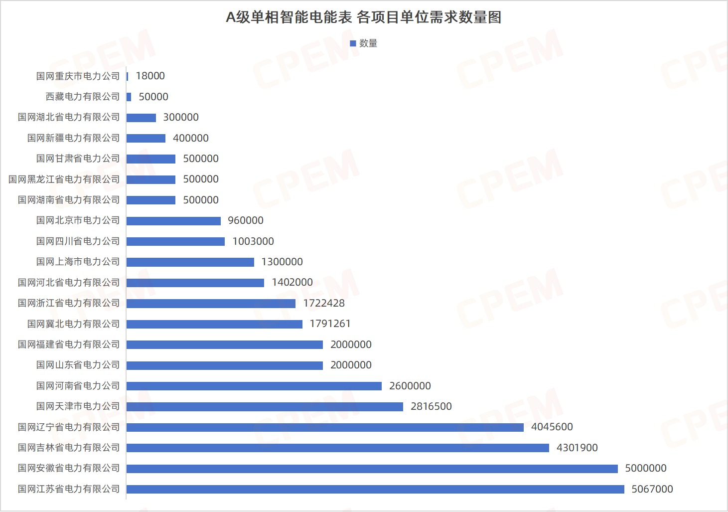 A級單相智能電能表招標項目單位共計21個,其中國國網江蘇省電力有限公司、國網安徽省電力有限公司、國網吉林省電力有限公司三個項目單位需求數量分列前三,單相智能電能表,A級,遠程,內置,有,220V,5A該款產品的需求量最大,達35464761臺。