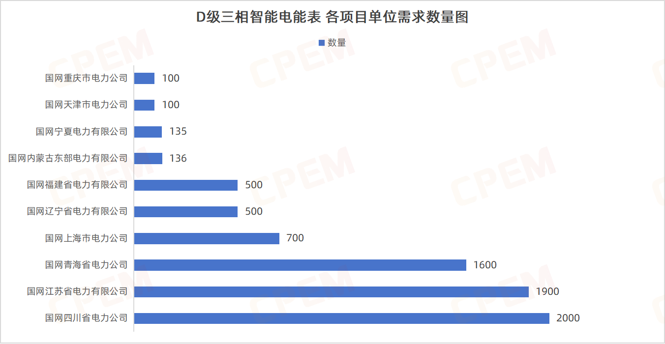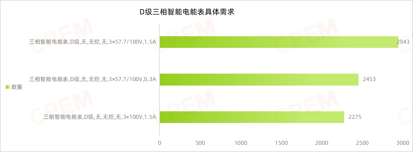 D級三相智能電能表招標項目單位共計10個,其中國國網四川省電力公司、國網江蘇省電力有限公司、國網青海省電力公司三個項目單位需求數量分列前三。D級三相智能電能表下三款產品需求數比較均衡,其中三相智能電能表,D級,無,無控,無,3×57.7/100V,1.5A該款產品的需求量略高,為2943臺。