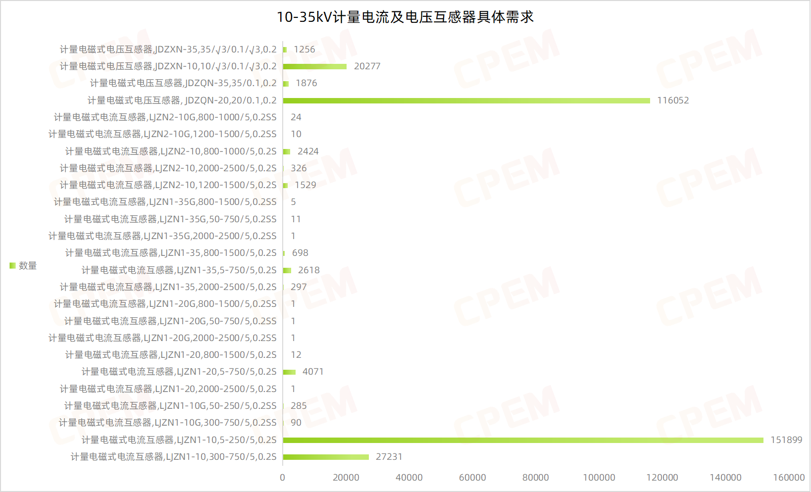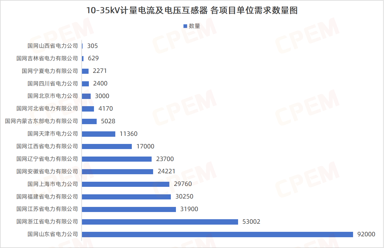 10-35kV計量電流及電壓互感器招標項目單位共計16個,其國國網山東省電力公司、國網浙江省電力有限公司、國網江蘇省電力有限公司三個項目單位需求數量分列前三,計量電磁式電流互感器,LJZN1-10,5-250/5,0.2S和計量電磁式電壓互感器, JDZQN-20,20/0.1,0.2兩款產品的需求量遙遙領先,分別為151899臺和116052臺。