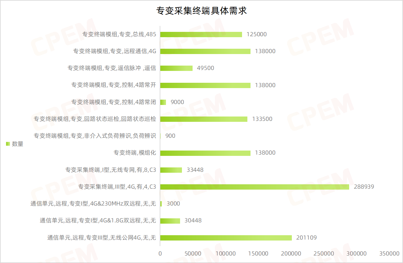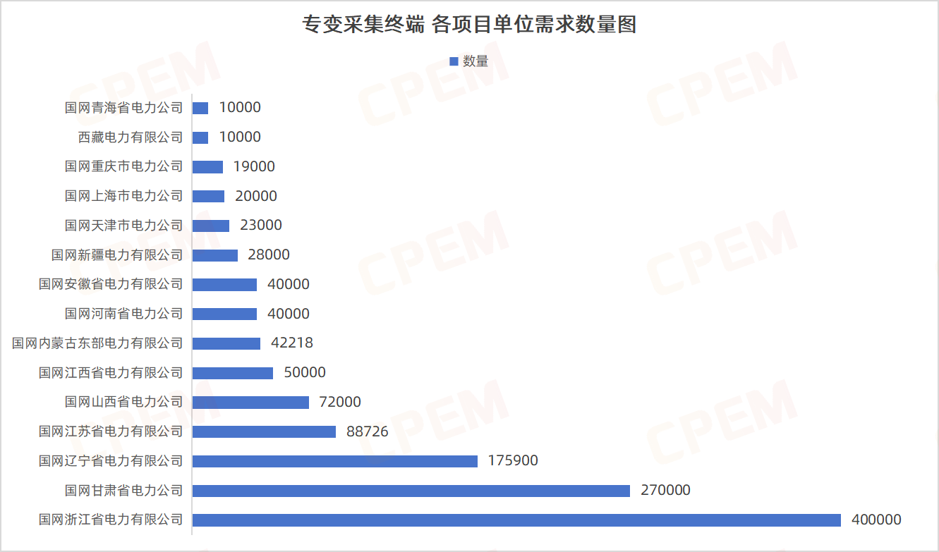 專變采集終端招標項目單位共計15個,其國網浙江省電力有限公司、國網甘肅省電力公司、國網遼寧省電力有限公司三個項目單位需求數量分列前三,專變采集終端,III型,4G,有,4,C3該款產品的需求量最大,達288939臺。