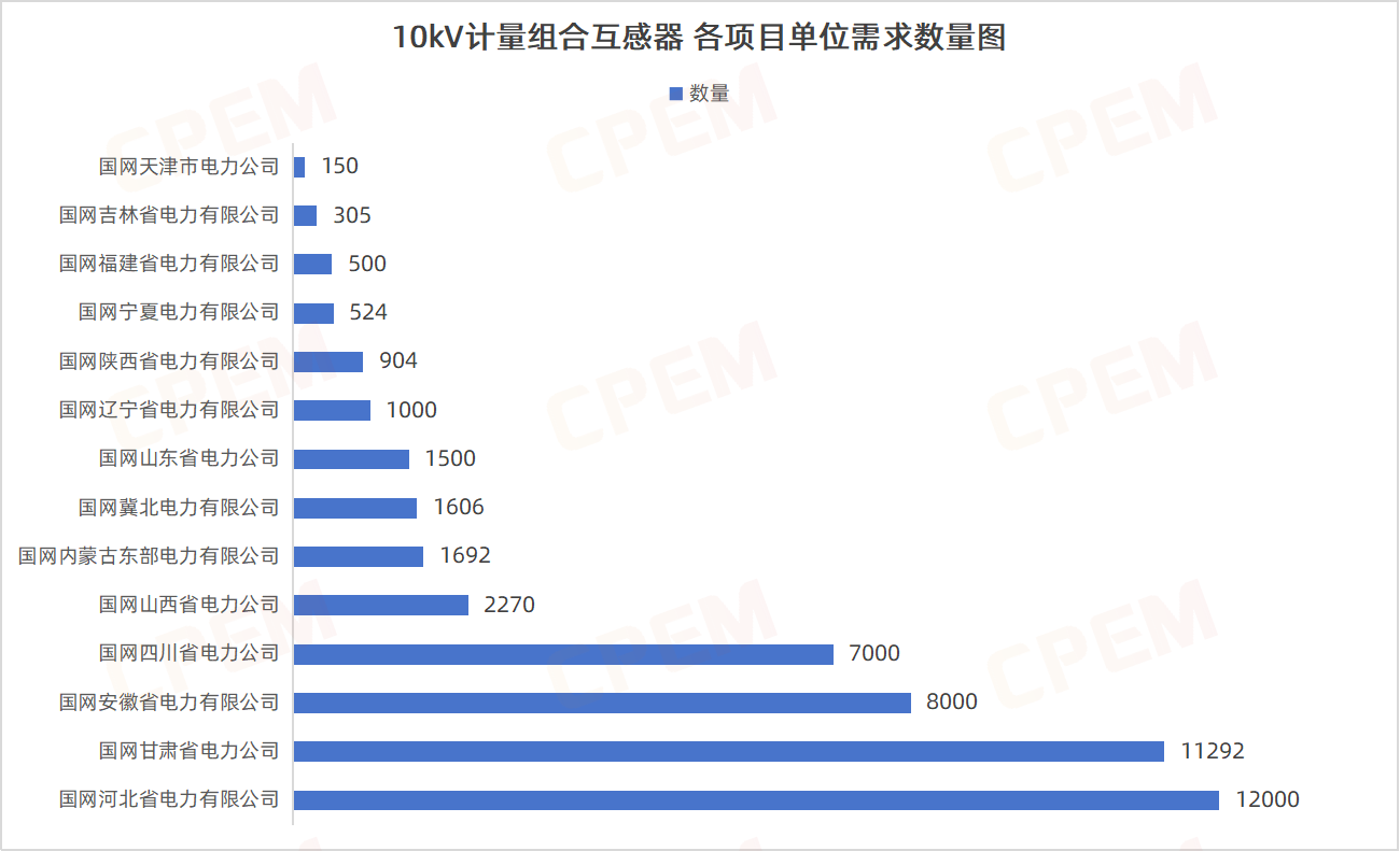 10kV計量組合互感器招標項目單位共計14個,其國國網河北省電力有限公司、國網甘肅省電力公司、國網安徽省電力有限公司三個項目單位需求數量分列前三,計量組合互感器,JZZV1-10,5-600/5、10/0.1,0.2S該款產品的需求量較大,為39576臺。