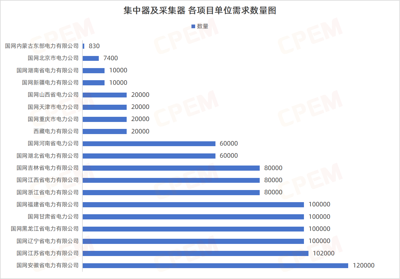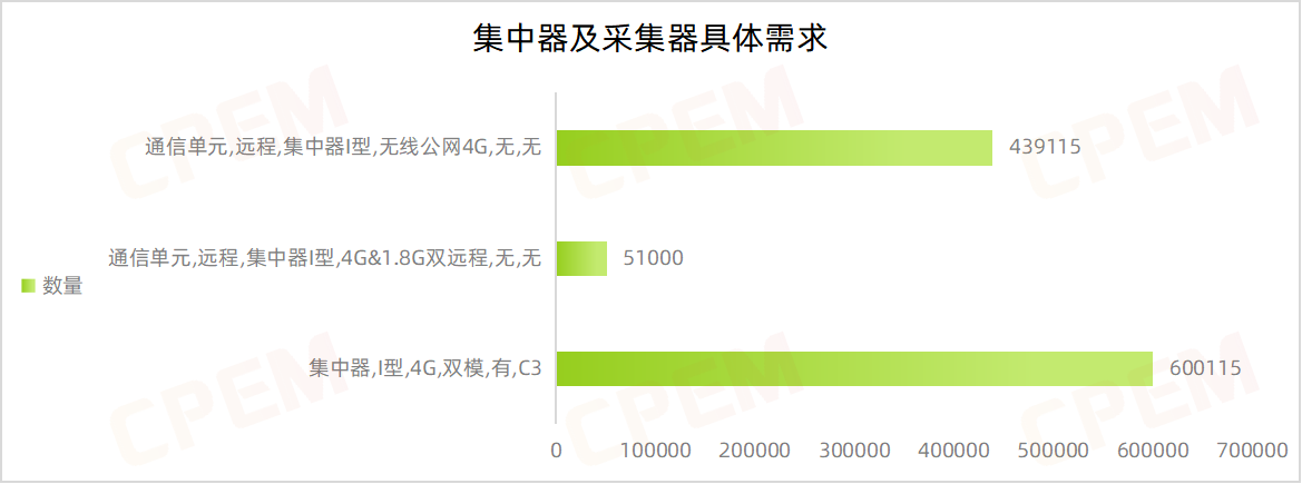 集中器及采集器招標項目單位共計19個,其中國網安徽省電力有限公司需求數量最多,國網江蘇省電力有限公司、國網遼寧省電力有限公司、國網黑龍江省電力有限公司、國網甘肅省電力公司、國網福建省電力有限公司緊隨其后,集中器,I型,4G,雙模,有,C3該款產品的需求量最大,達600115臺。