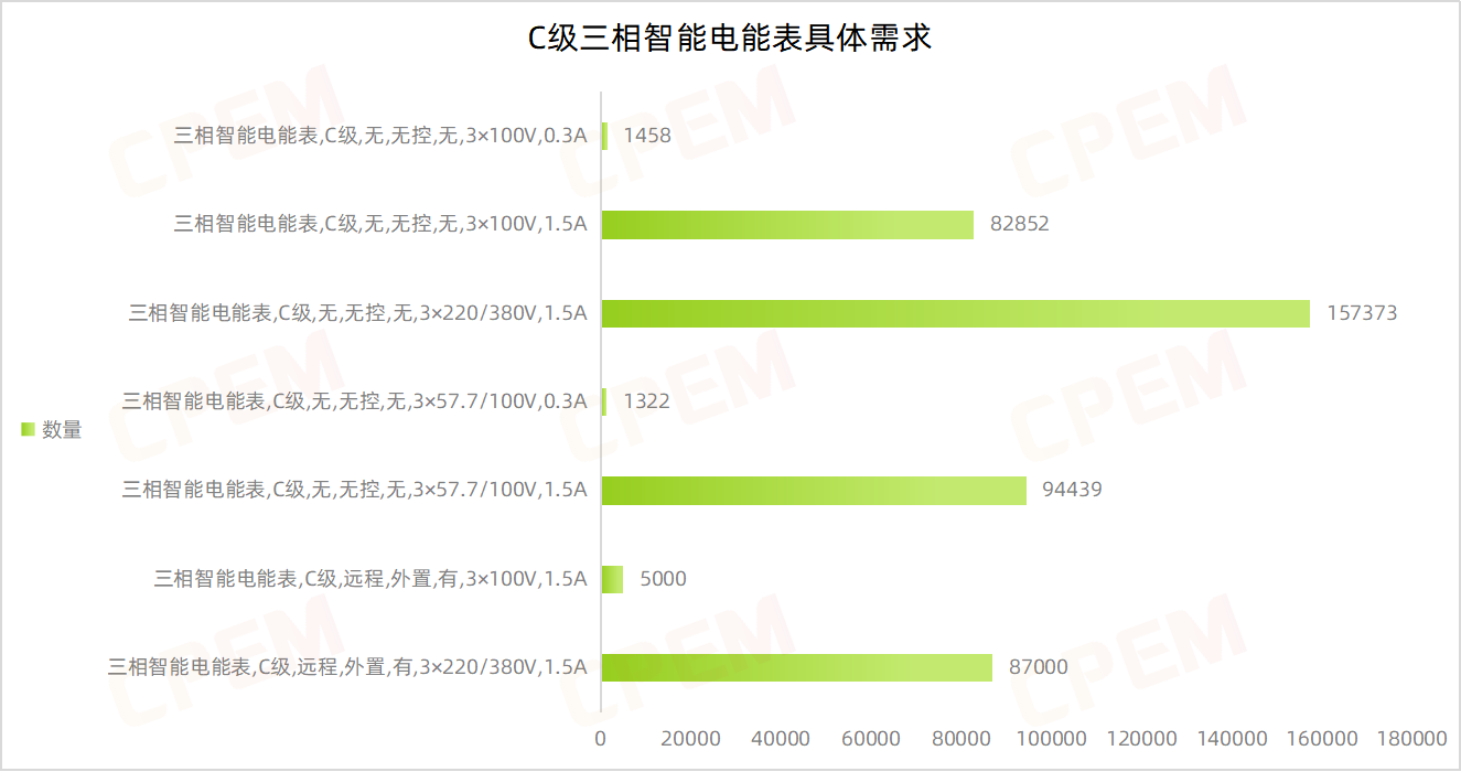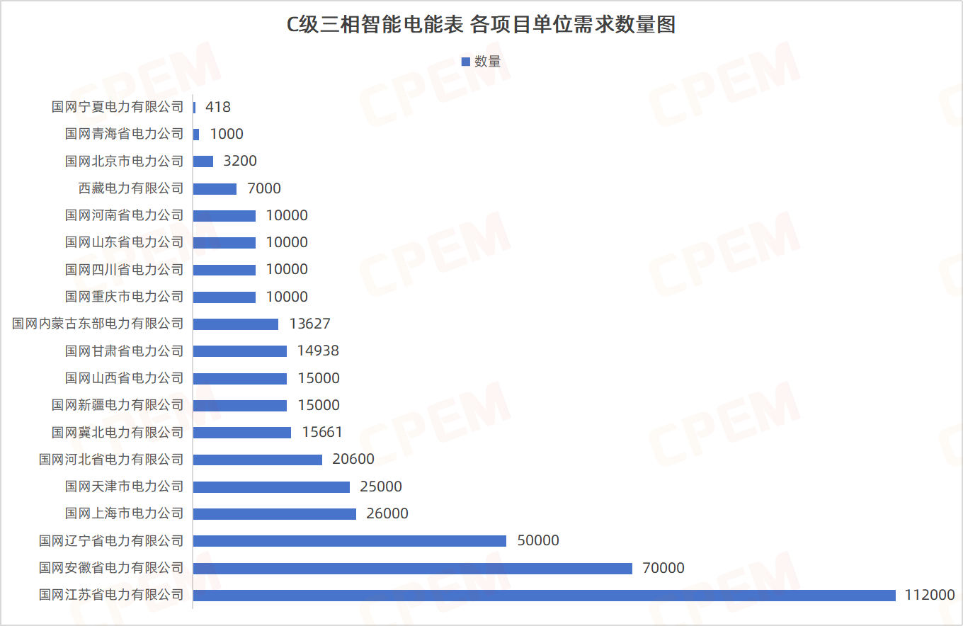 C級三相智能電能表招標項目單位共計19個,其中國國網江蘇省電力有限公司、國網安徽省電力有限公司、國網遼寧省電力有限公司三個項目單位需求數量分列前三,三相智能電能表,C級,無,無控,無,3×220/380V,1.5A該款產品的需求量最大,達157373臺。