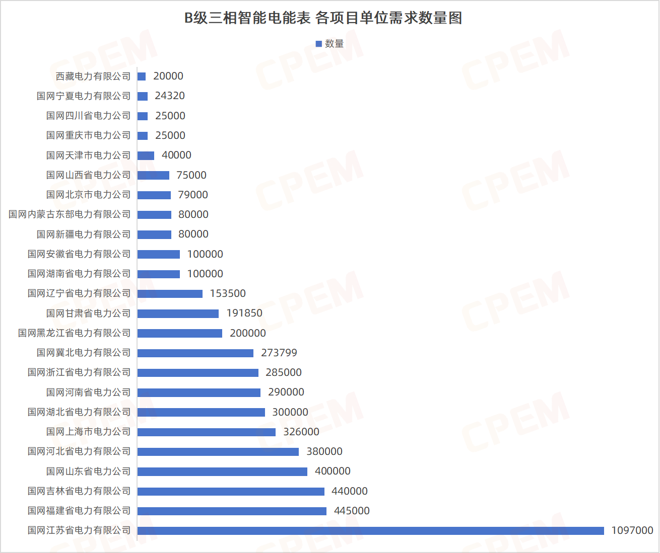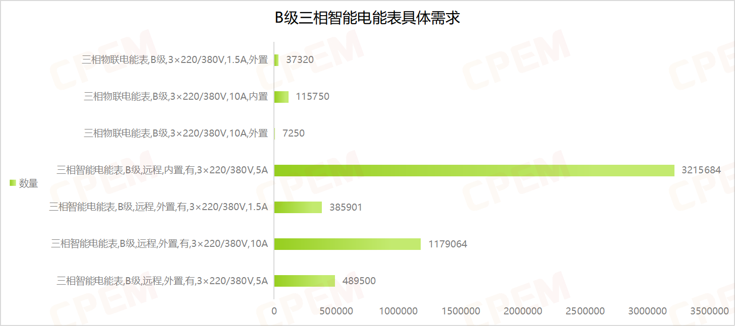B級三相智能電能表招標項目單位共計24個,其中國國網江蘇省電力有限公司、國網福建省電力有限公司、國網吉林省電力有限公司三個項目單位需求數量分列前三,三相智能電能表,B級,遠程,內置,有,3×220/380V,5A該款產品的需求量最大,達3215684臺。