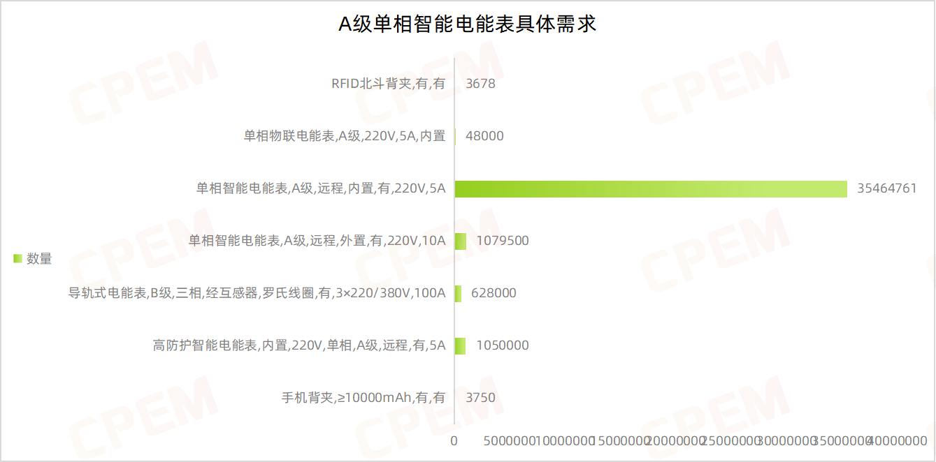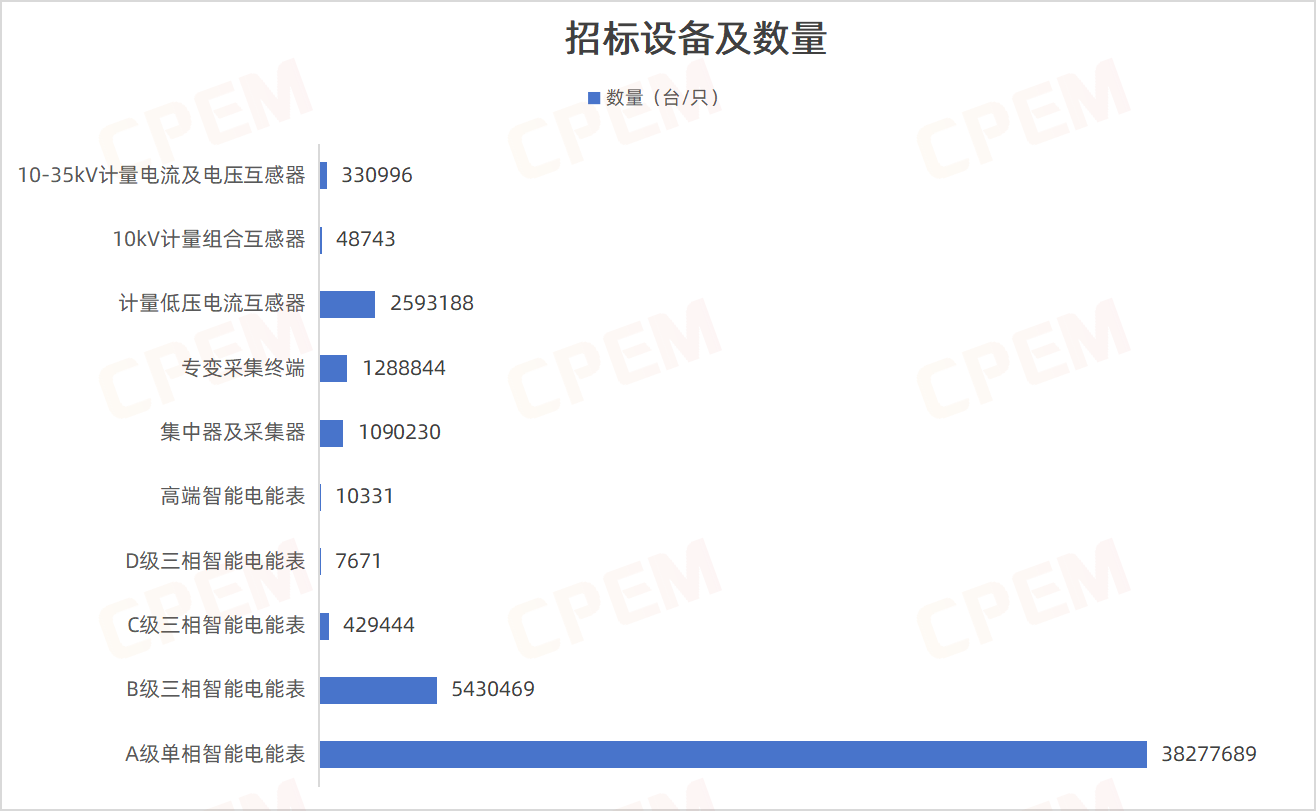 招標合計采購設備49507605臺/只,其中A級單相智能電能表數量最多,達38277689臺;其次為B級三相智能電能表,5430469臺。