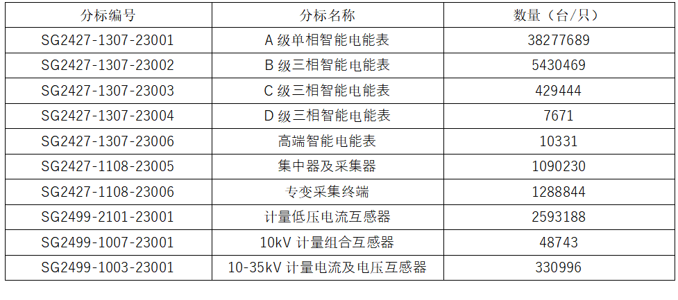 2024年2月23日,國家電網發布了2024年第十五批采購(營銷項目第一次計量設備招標采購)招標公告及2024年新增第八批采購(營銷項目第一次計量互感器招標采購)招標公告,兩份招標合計采購設備分為10大類,如下: