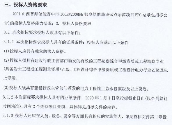 山西晉中100MW/200MWh共享儲能基地試點示范項目EPC招標