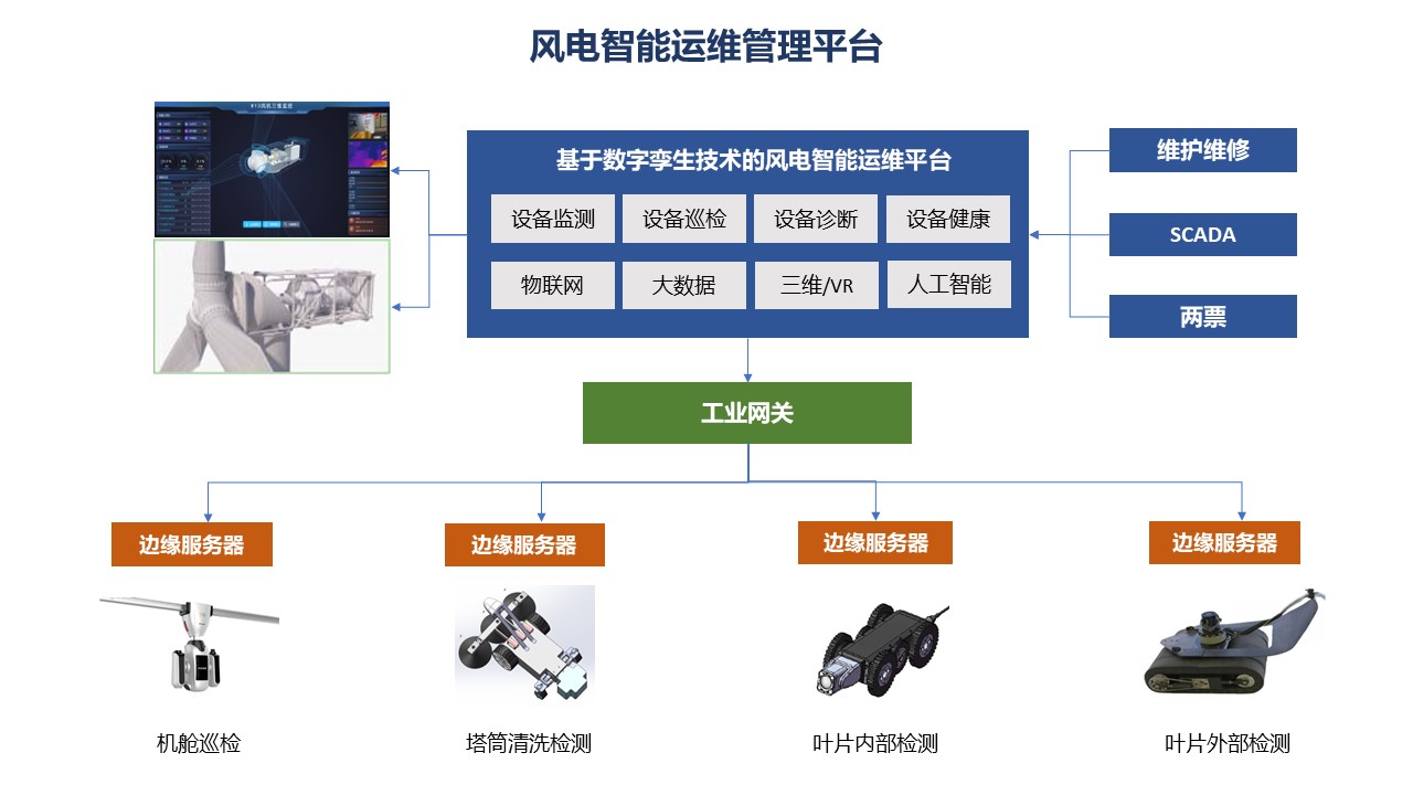 在大數(shù)據(jù)與電力平價時代,想要進一步提高風電系統(tǒng)運行的安全性與穩(wěn)定性,實現(xiàn)風電運維提質(zhì)增效降成本,便格外需要一套實時監(jiān)測、及時診斷、高效響應(yīng)的智慧運維管理方案。中安吉泰借助企業(yè)優(yōu)越的核心部件研發(fā)、整體產(chǎn)品集成的技術(shù)優(yōu)勢,以及大數(shù)據(jù)計算、機器智能互聯(lián)、各類圖像識別分析以及核心算法等能力,創(chuàng)新性地研發(fā)了以“機器人巡檢作業(yè) + 數(shù)字孿生智慧管理平臺”為核心的一體化智慧風電運維解決方案,從智能化巡檢到大數(shù)據(jù)深度采集,再到機器人清潔作業(yè),為行業(yè)提供著專業(yè)先進的,集智能軟硬件于一體的解決方案及產(chǎn)品。