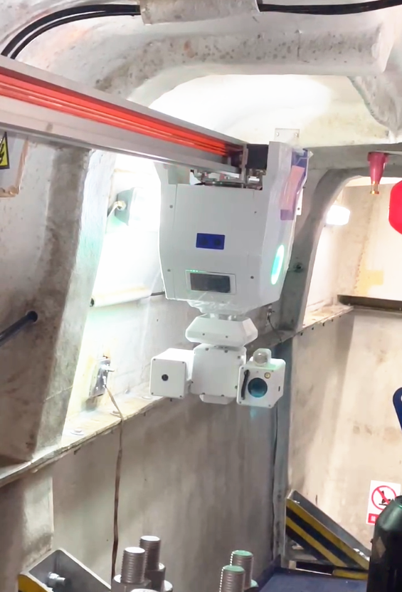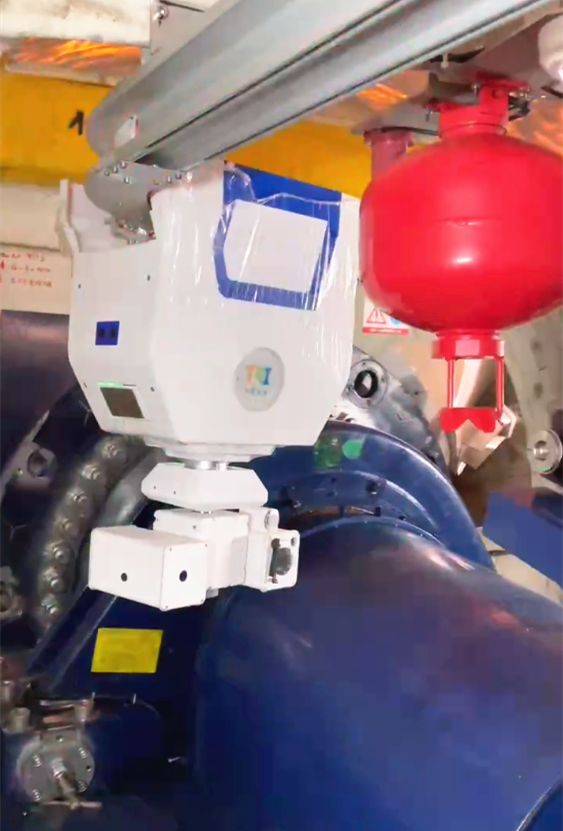風電機艙巡檢機器人安裝在風機機艙內(nèi)架設(shè)的軌道上,采用滑觸線供網(wǎng)供電,搭載可見光和紅外相機,可通過伸縮桿和云臺全方位觀察清洗機艙內(nèi)的情況,同時具備針對機艙內(nèi)各種表計的智能識別功能,以及跑冒滴漏、人員違規(guī)行為、異響分析、振動監(jiān)測等功能。