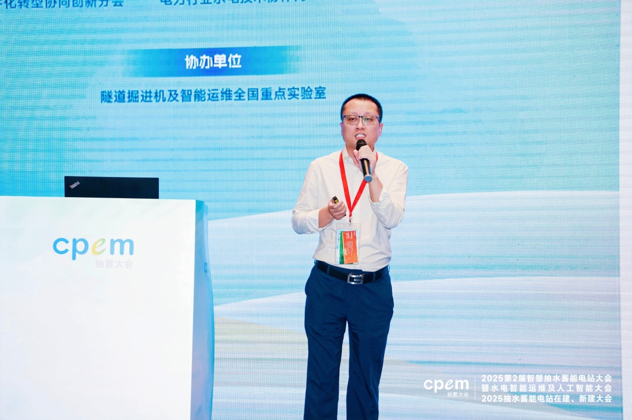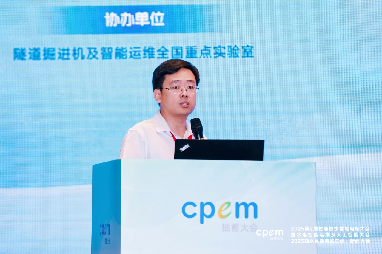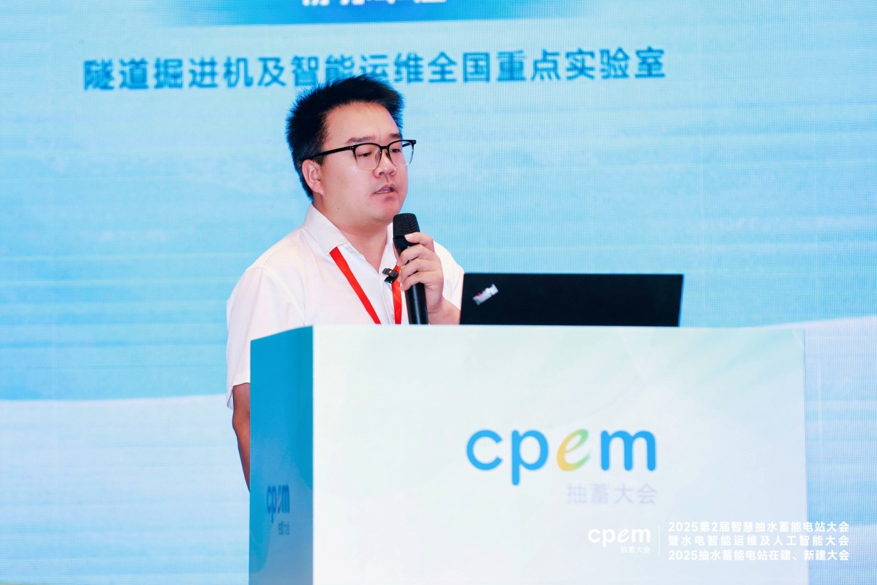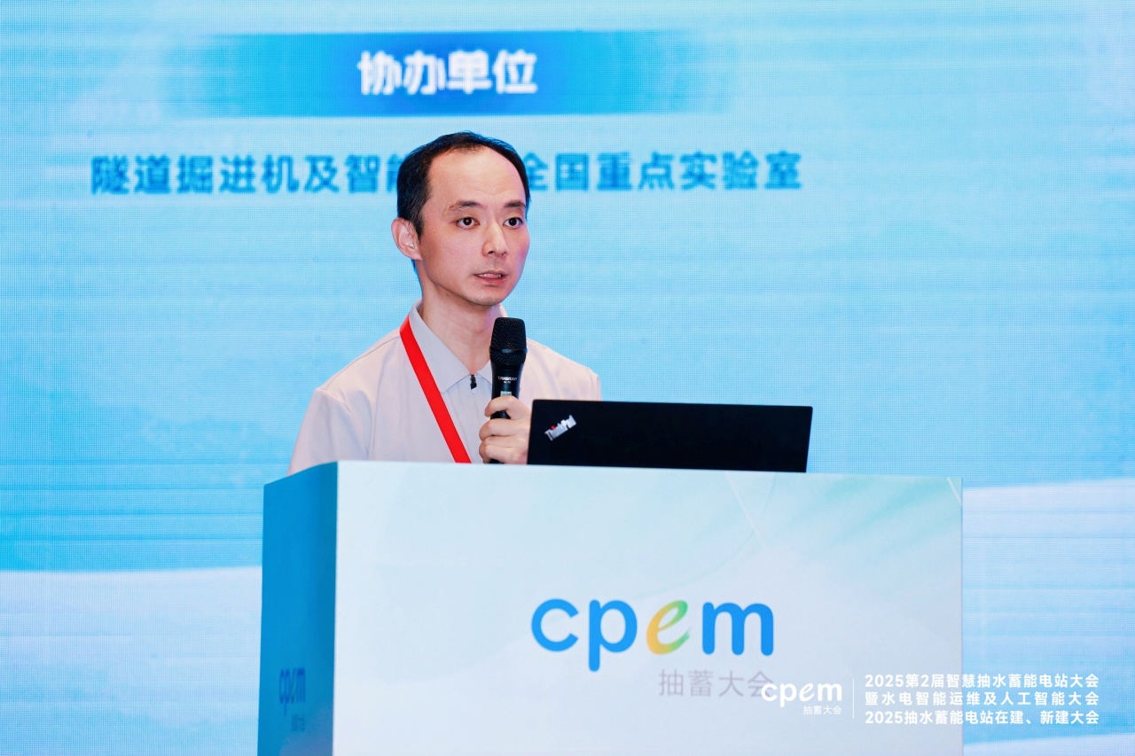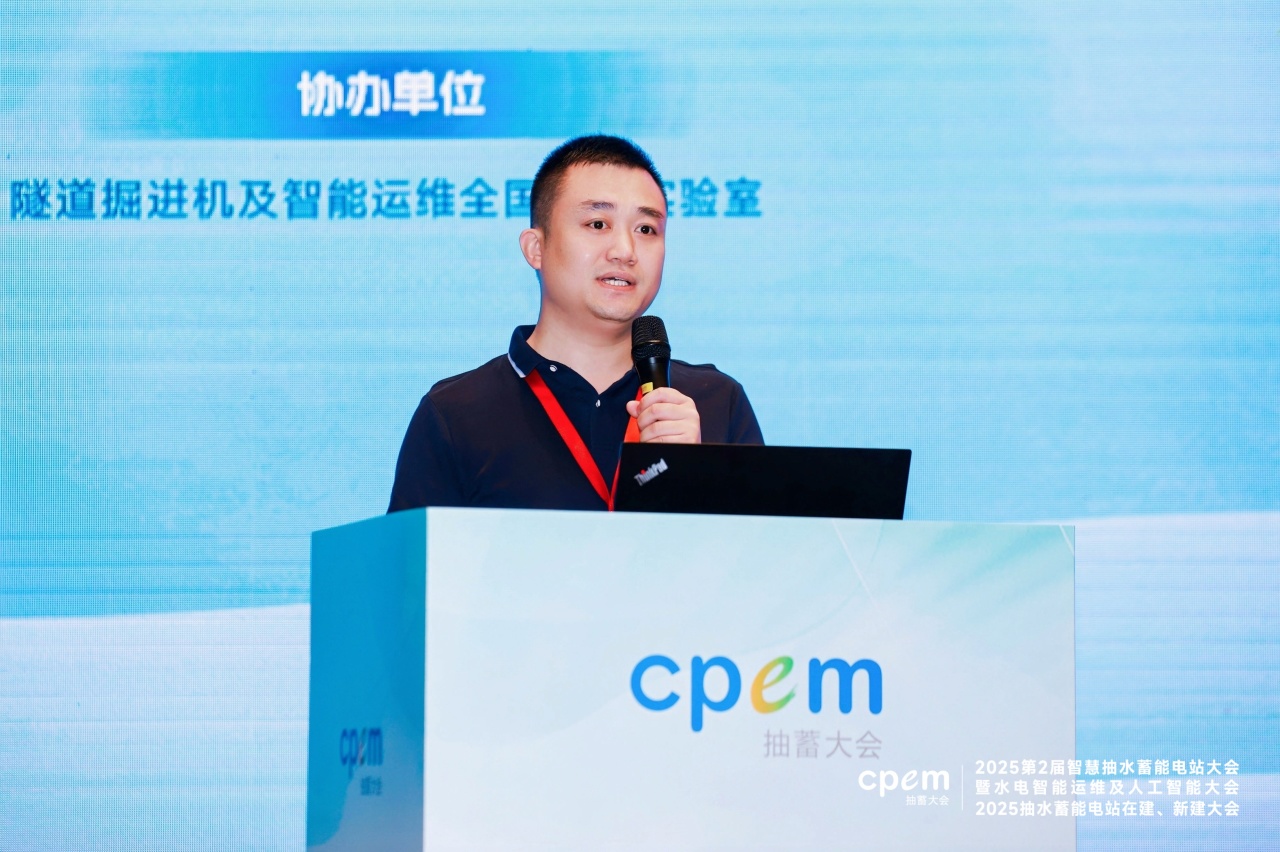 中國水利水電第六工程局有限公司科技與數字化部副主任汪云峰作《大型抽水蓄能電站上水庫及引水系統智能建造關鍵技術研究與應用》主題分享。