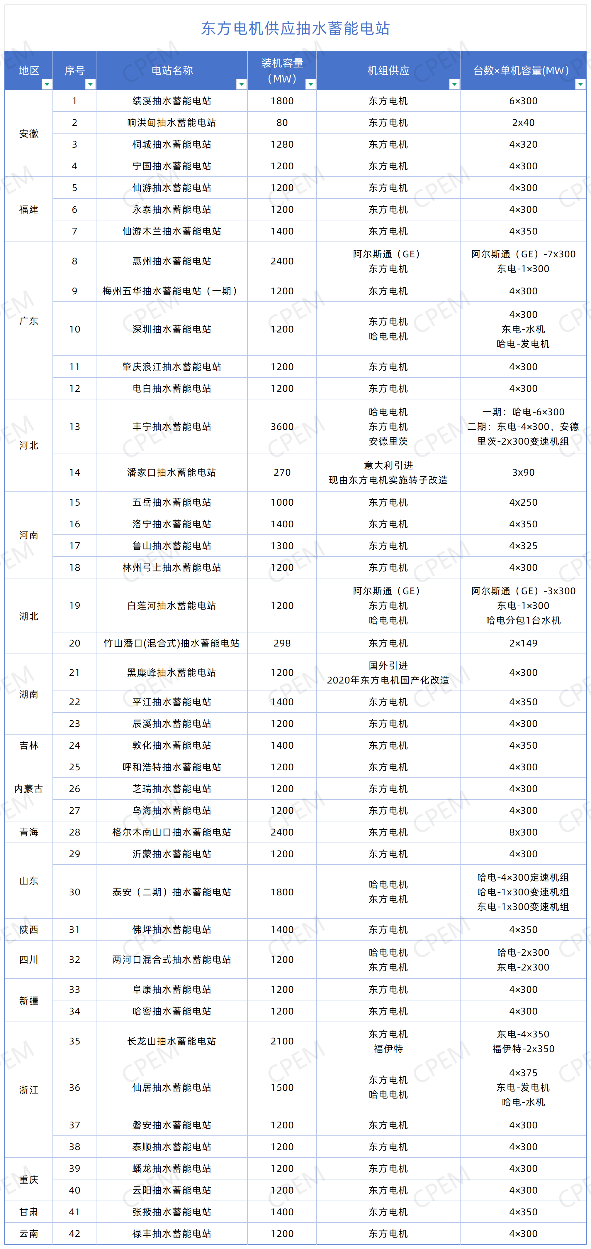 據CPEM不完全統計,東方電機供應的抽水蓄能電站如下: