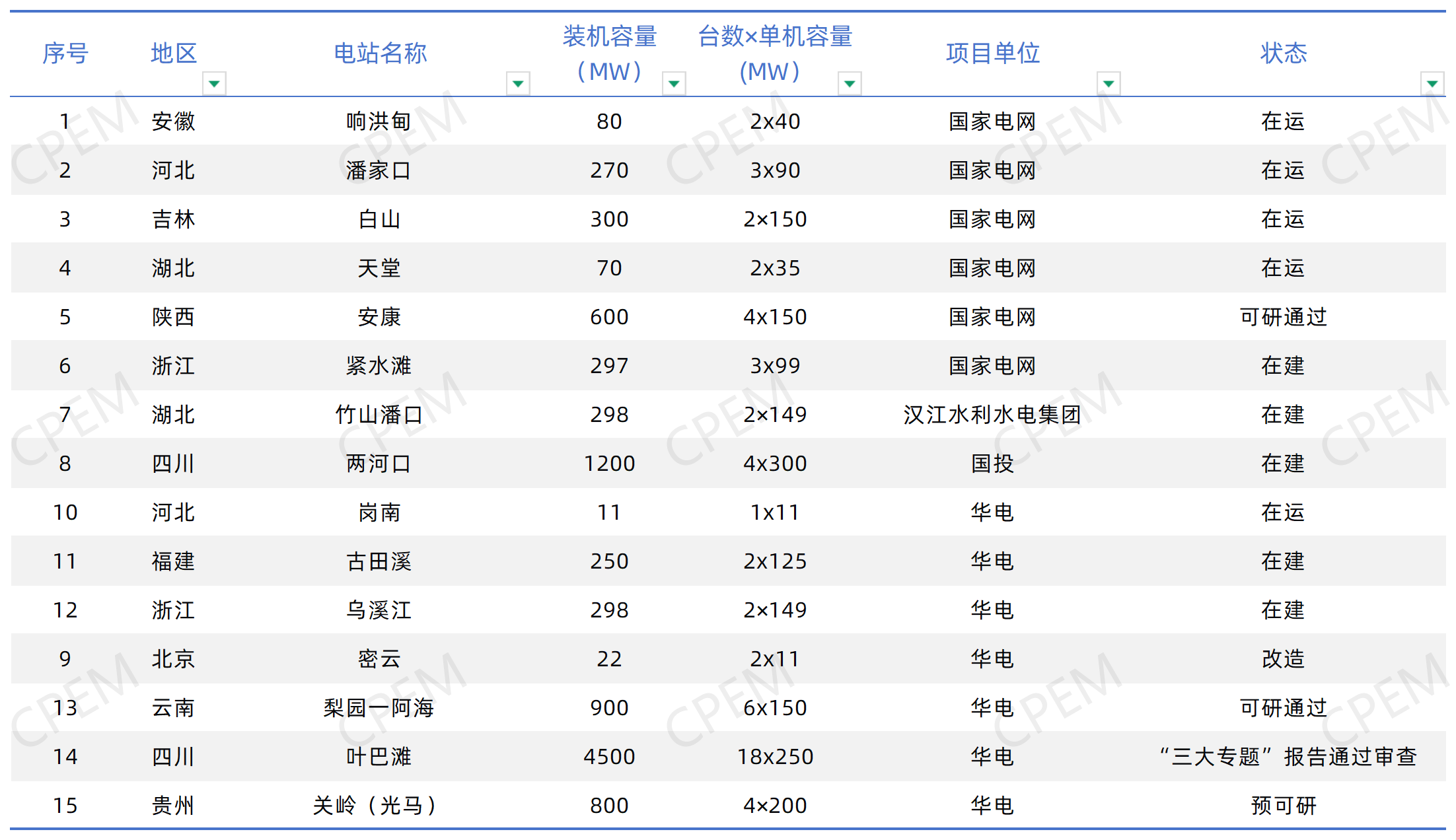 CPEM統計了目前我國在運、在建及尚處于可研/預可研階段的混合式抽水蓄能電站,如下:
