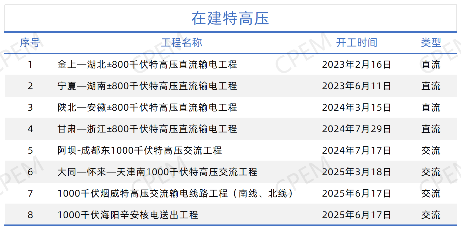 2025年6月17日,隨著1000千伏煙威特高壓線路工程北線、南線和海陽辛安核電送出線路基礎施工首基試點的開工,我國在建特高壓線路工程達8條,包括4條±800千伏直流工程(金上—湖北、寧夏—湖南、陜北—安徽、甘肅—浙江)和4條1000千伏交流工程(大同—懷來—天津南、阿壩—成都東、煙威、海陽辛安核電送出),具體如下: