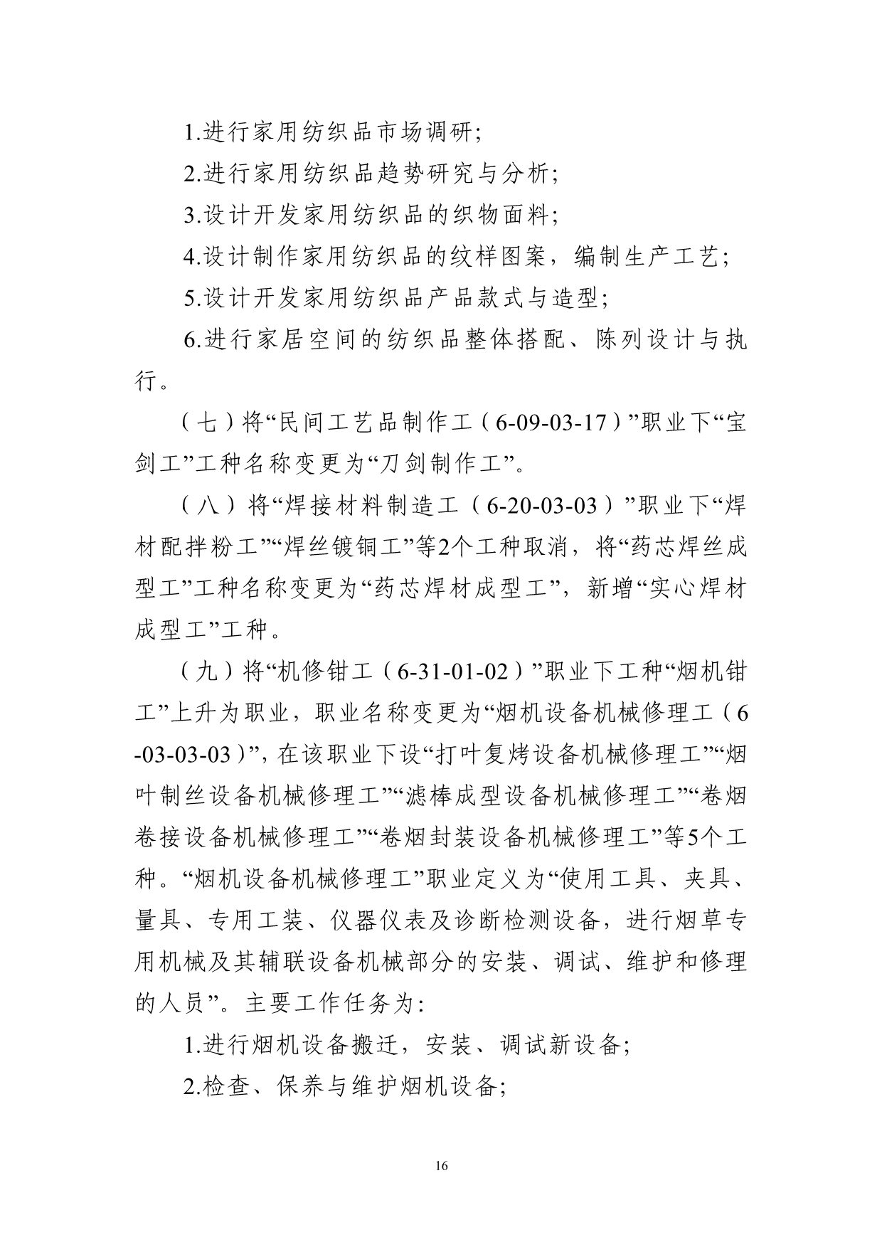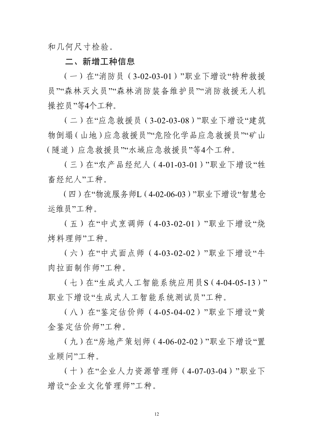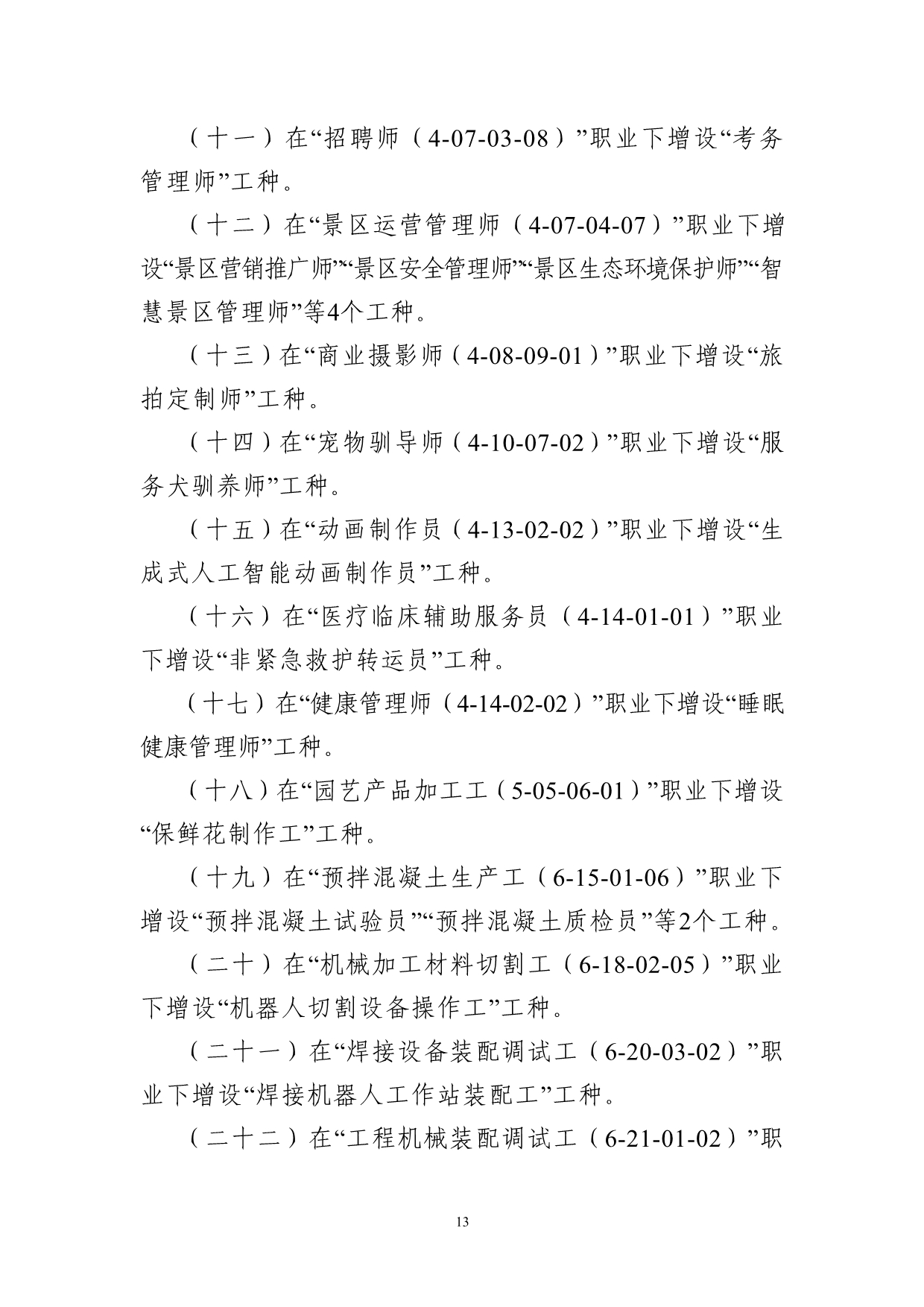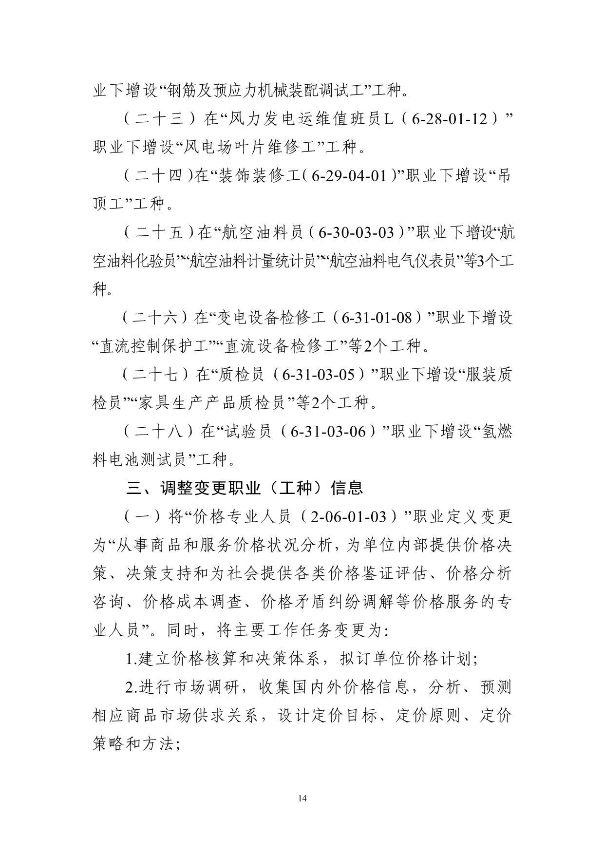 檢驗檢測管理工程技術人員、養老服務師、跨境電商運營管理師S、無人機群飛行規劃員、裝修管家、工傷預防咨詢師、電子電路設計師、室內環境治理員、家政服務經理人、電力可靠性管理員L、電力聚合運營員L/S、農村集體經濟經理人、代用茶加工工、咖啡加工工、碳纖維制品成型制作工、鐵氧體磁體制造工、鋼結構裝配工。(S表示數字職業,L表示綠色職業。)