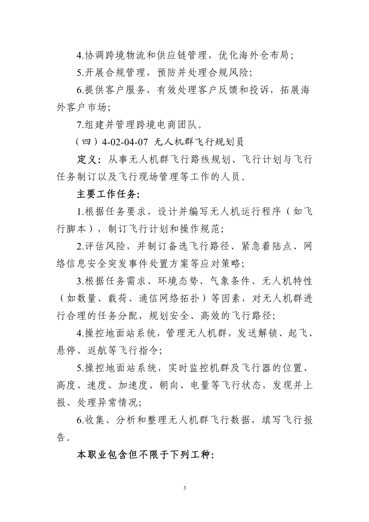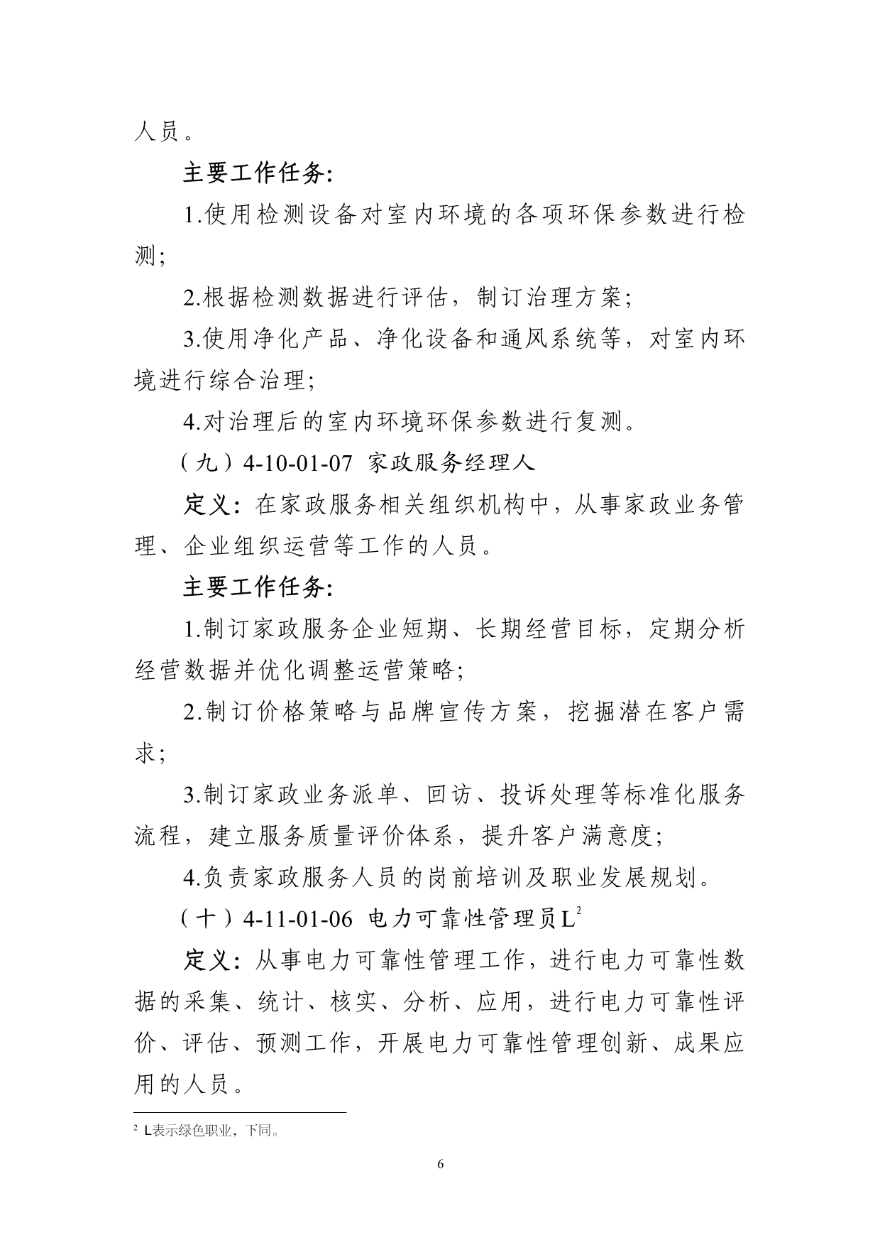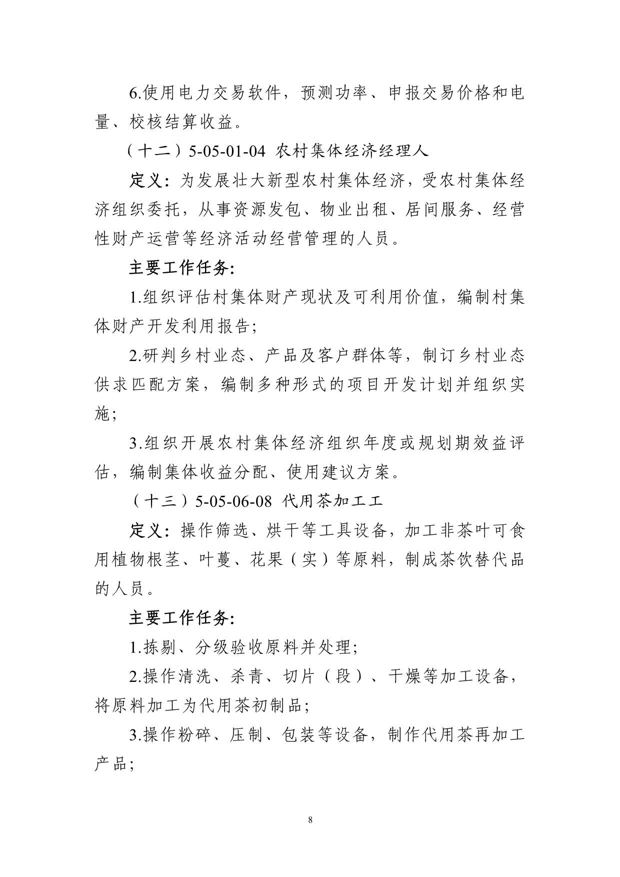檢驗檢測管理工程技術人員、養老服務師、跨境電商運營管理師S、無人機群飛行規劃員、裝修管家、工傷預防咨詢師、電子電路設計師、室內環境治理員、家政服務經理人、電力可靠性管理員L、電力聚合運營員L/S、農村集體經濟經理人、代用茶加工工、咖啡加工工、碳纖維制品成型制作工、鐵氧體磁體制造工、鋼結構裝配工。(S表示數字職業,L表示綠色職業。)