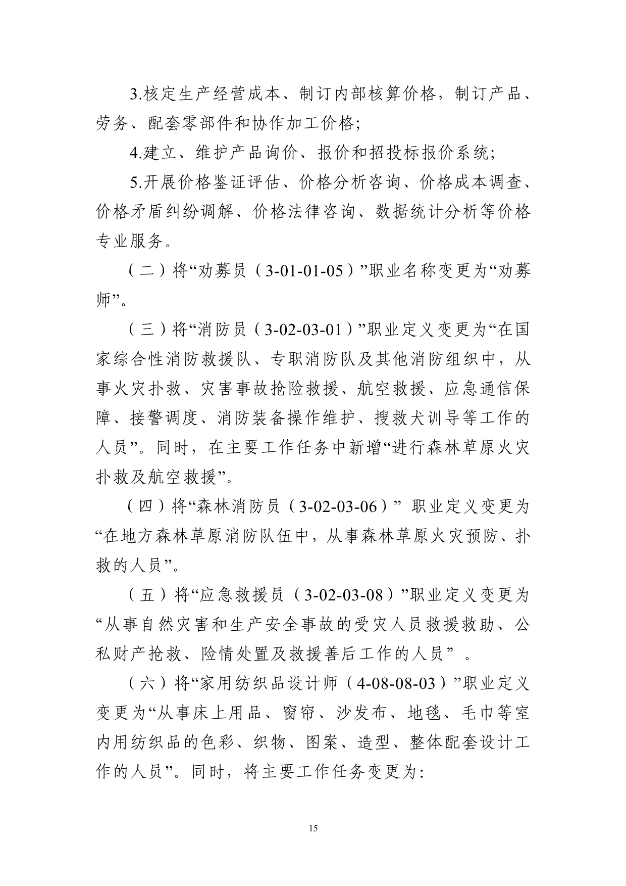 根據《中華人民共和國勞動法》有關規定,為貫徹落實《關于加強新時代高技能人才隊伍建設的意見》提出的“健全符合我國國情的現代職業分類體系,完善新職業信息發布制度”要求,積極挖掘、培育新的職業序列,開發新的就業增長點,我們面向社會持續公開征集新職業信息。經專家評估論證、書面征求中央和國家機關有關部門意見、面向社會公開征求意見等程序,此次遴選確定了檢驗檢測管理工程技術人員等17個新職業、特種救援員等42個新工種信息,調整變更了9個職業(工種)信息,現予發布。
