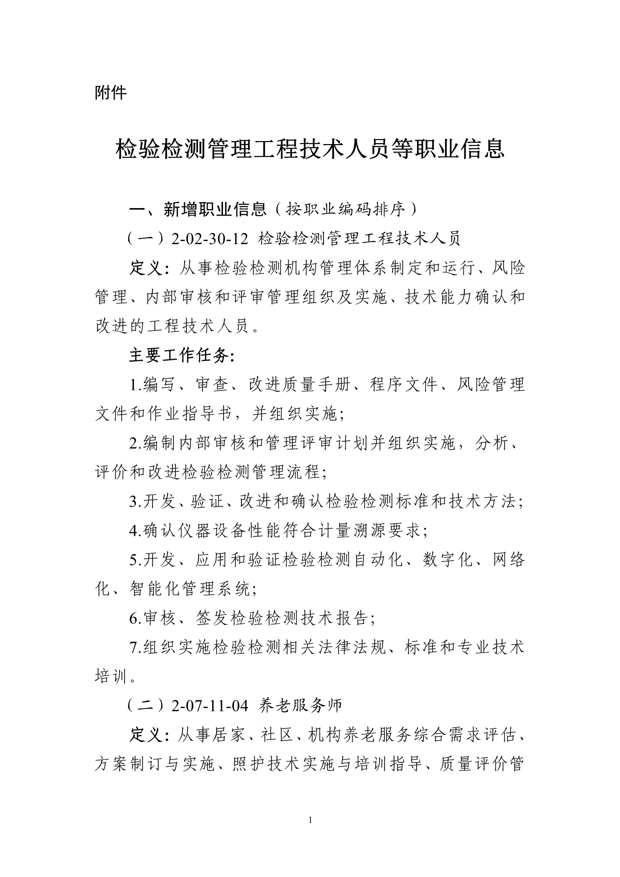 人力資源社會保障部辦公廳 市場監管總局辦公廳 國家統計局辦公室關于發布檢驗檢測管理工程技術人員等職業信息的通知