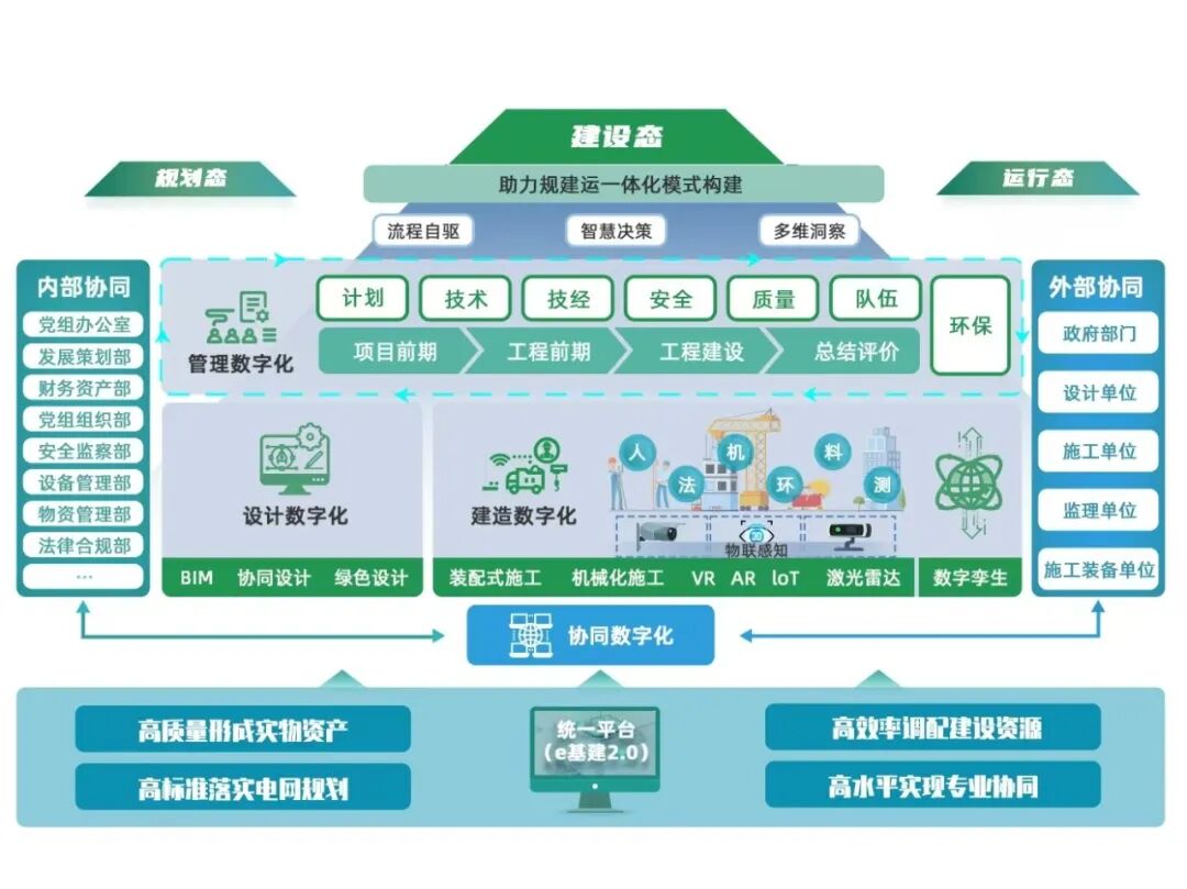e基建2.0是立足基建專業過程性、基礎性、移動性、外部性等特征,打造的統一數字化平臺。以數據要素和數字技術為驅動,圍繞管理、設計、建造、協同四個方向轉型升級,主要構建以“六精”為主要內涵的專業管理體系,實現基建各項目、各環節、各專業線上管控,推進以“四化”為基本特征的高質量建設業務支撐,解決基建業務線上管控、現場減負增效等實際業務問題,助力“規建運”一體化電網建設模式構建。