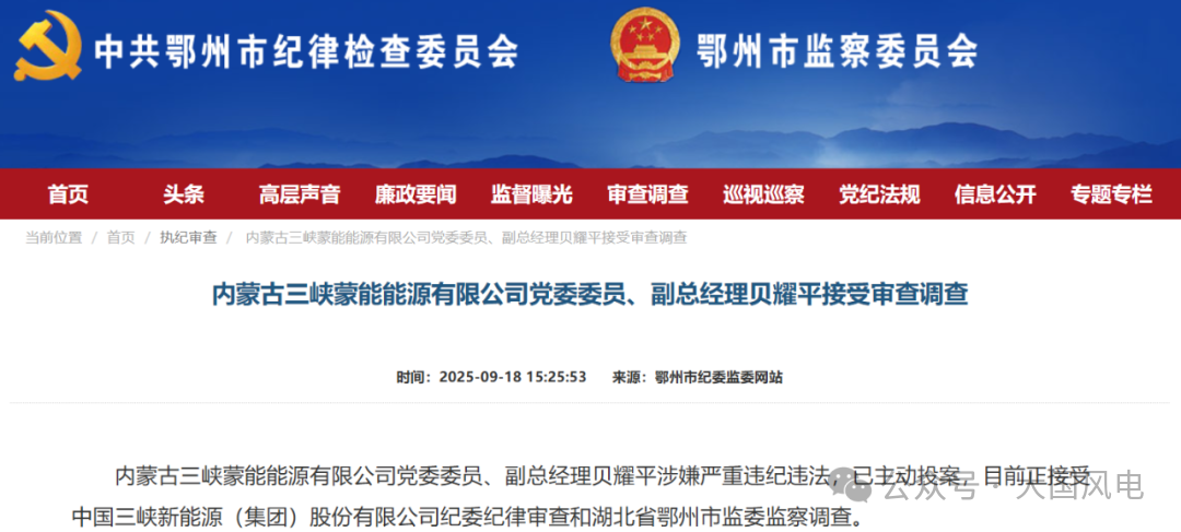 內蒙古三峽蒙能能源有限公司黨委委員、副總經理貝耀平涉嫌嚴重違紀違法,已主動投案,目前正接受中國三峽新能源(集團)股份有限公司紀委紀律審查和湖北省鄂州市監委監察調查。
