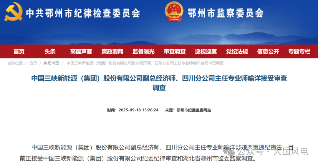 據鄂州市紀委監委網站9月18日消息,中國三峽新能源(集團)股份有限公司副總經濟師、四川分公司主任專業師喻洋涉嫌嚴重違紀違法,目前正接受中國三峽新能源(集團)股份有限公司紀委紀律審查和湖北省鄂州市監委監察調查。