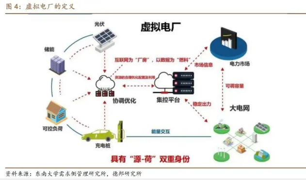 另外,由于小型分布式新能源發(fā)電設施、儲能設施、可控制用電設備、電動汽車等的持續(xù)發(fā)展普及,在用電側,很多電力用戶也從單一的消費者轉變?yōu)榛旌闲螒B(tài)的產銷者,并且各類激增的大功率用電設備(如充電樁)“吃”起電來,也是讓電網直呼壓力山大, 顯然不能任由其“胃口大開”一哄而上。因而,新的發(fā)用電勢態(tài)下,“虛擬電廠”應運而生。