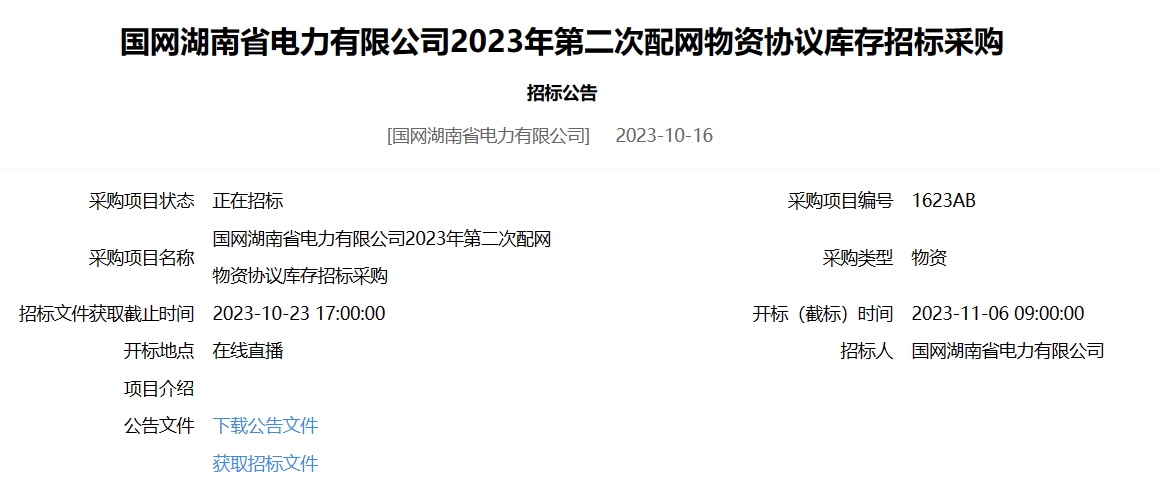 10月16日,國網湖南省電力有限公司發布“2023年第二次配網物資協議庫存公開招標采購”的招標公告。