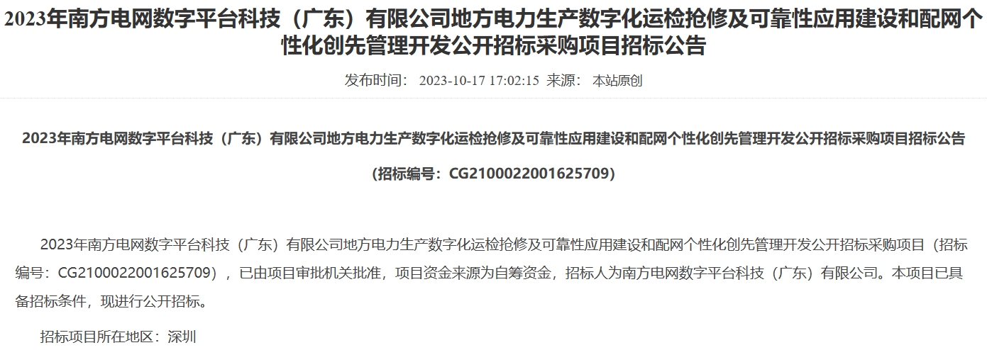 2023年南方電網數字平臺科技(廣東)有限公司地方電力生產數字化運檢搶修及可靠性應用建設和配網個性化創先管理開發公開招標采購項目招標公告