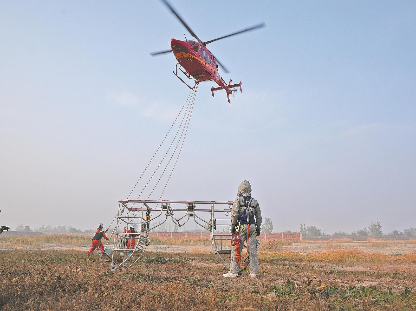 身穿屏蔽服的等電位作業人員張鵬睿在地面的吊籃中做出升空手勢,直升機機長隨即做出回應。隨著直升機升空,吊籃緩緩離開地面,將張鵬睿運至距地面200米的高空,并平穩送至導線缺陷點。“報告工作負責人,順利進入電場。”工作負責人王德勝的對講機里傳來張鵬睿的聲音。