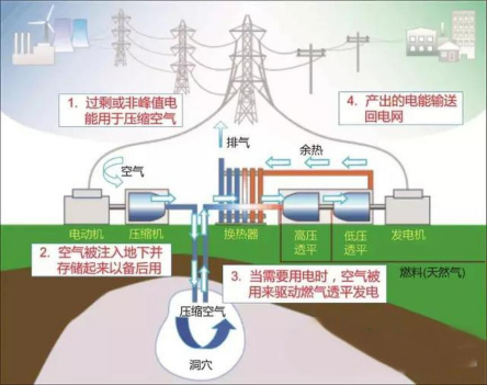 工作原理:在電力充足時,將空氣高壓密封在報廢礦井、沉降的海底儲氣罐、山洞、過期油氣井或新建儲氣井中。當電力需求增加時,釋放壓縮空氣推動汽輪機發電的儲能方式。