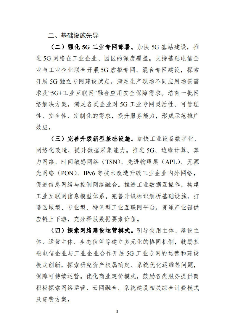 政策提到,加快5G基站建設,推進5G網絡在工業企業、園區的深度覆蓋。支持基礎電信企業與工業企業聯合開展5G虛擬專網、混合專網建設,探索開展5G獨立專網建設試點,滿足生產現場不同應用場景需求及“5G+工業互聯網”融合應用安全保障需求。培育一批網絡解決方案,滿足各類企業對5G工業專網靈活性、可管理性、安全性、定制化的需求,提升服務能力,形成示范推廣效應。