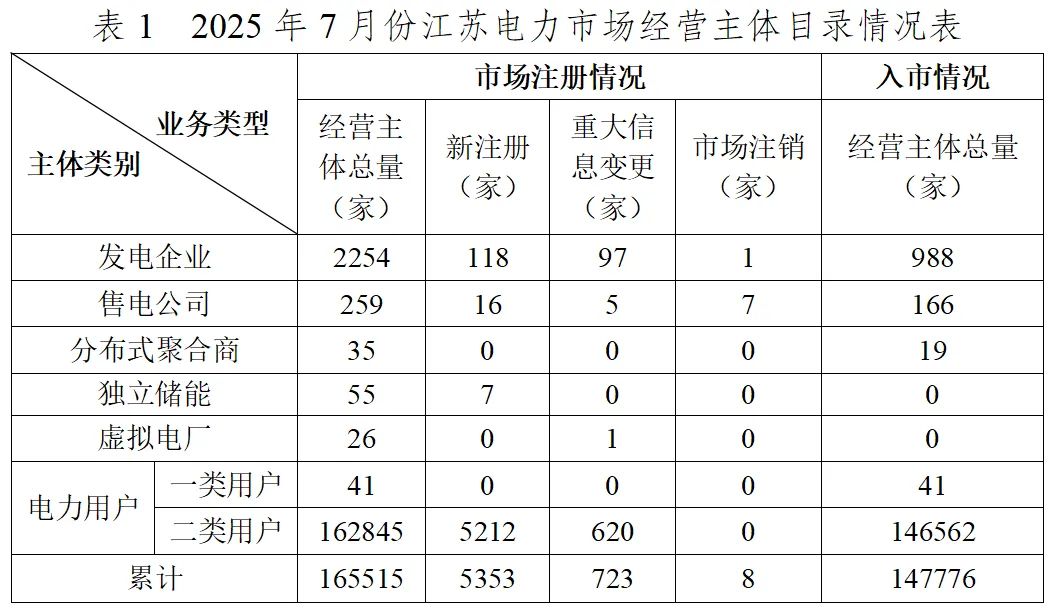截至2025年7月31日,江蘇電力市場經營主體共計165515家,其中發電企業2254家,售電公司259家,分布式聚合商35家,獨立儲能企業55家,虛擬電廠26家,電力用戶162886家(一類用戶41家,二類用戶162845家)。