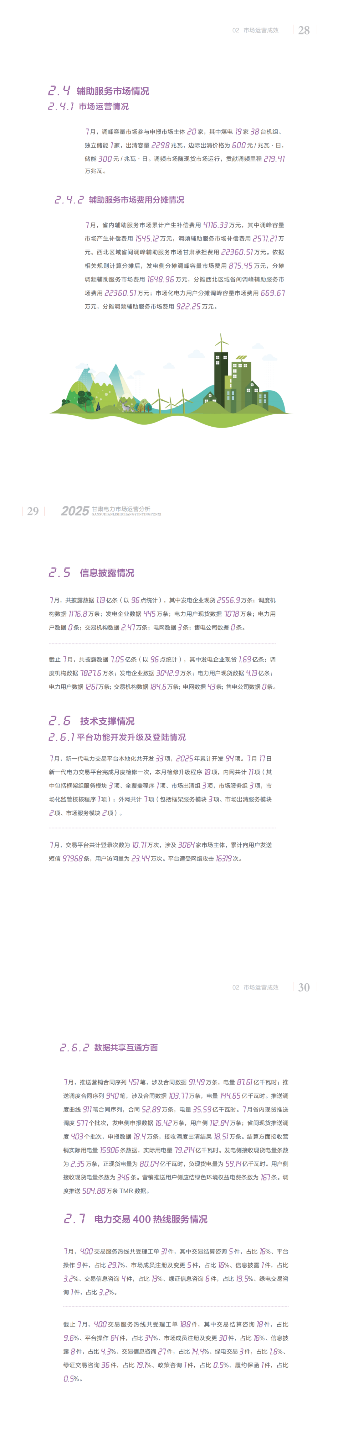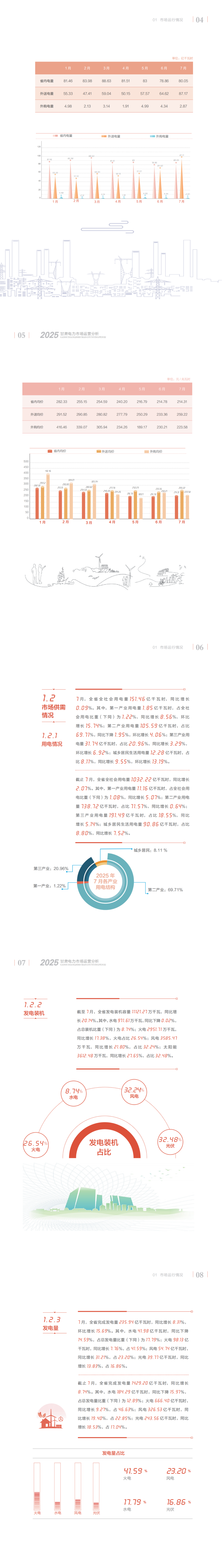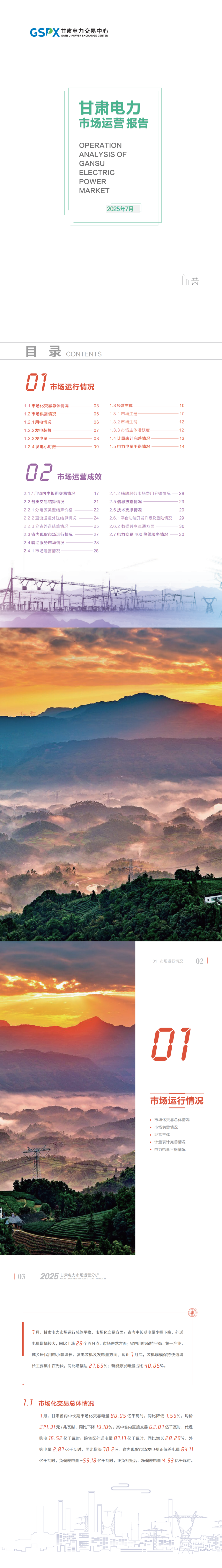 甘肅電力交易中心發布甘肅電力市場運營報告(2025年7月),報告顯示,7月,甘肅電力市場運行總體平穩,市場化交易方面:省內中長期電量小下降,外送電量增幅較大,同比上漲28個百分點。市場需求方面:省內用電保持平穩,第一產業城鄉居民用電小幅增長。發電裝機及發電量方面::截止了月底,裝機規保持快速長主要集中在光伏,同比增幅達 27.55%;新能源發電量占比40.05%。