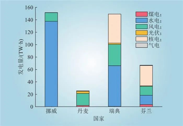 北歐地區的可再生能源豐富,水電集中分布在挪威和瑞典。如圖1所示,2023年挪威可再生能源發電量占比約為99.8%(水電和風電)、丹麥約為89.3%(風電和光伏)、瑞典約為68.3%(水電和風電)、芬蘭約為44.0%(水電和風電),整個北歐地區水電生產總量218 TW·h,占比55.42%。