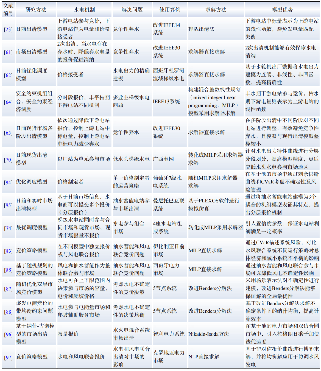 由于水電的發電原理和出力特性使得水電發電商在參與電力市場時面臨諸多問題,表7對比了研究水電參與電力市場時所解決的問題和設計的市場機制。
