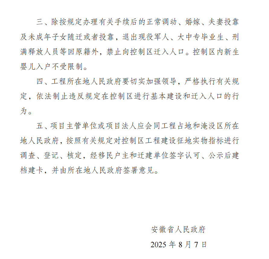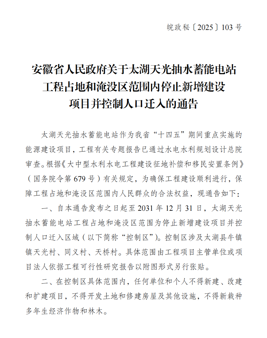 2025年8月11日,安徽省人民政府印發通告,要求在太湖天光抽水蓄能電站工程占地和淹沒區范圍內停止新增建設項目、控制人口遷入規模,此舉標志項目進入征地移民實質階段,為后續建設鋪路。