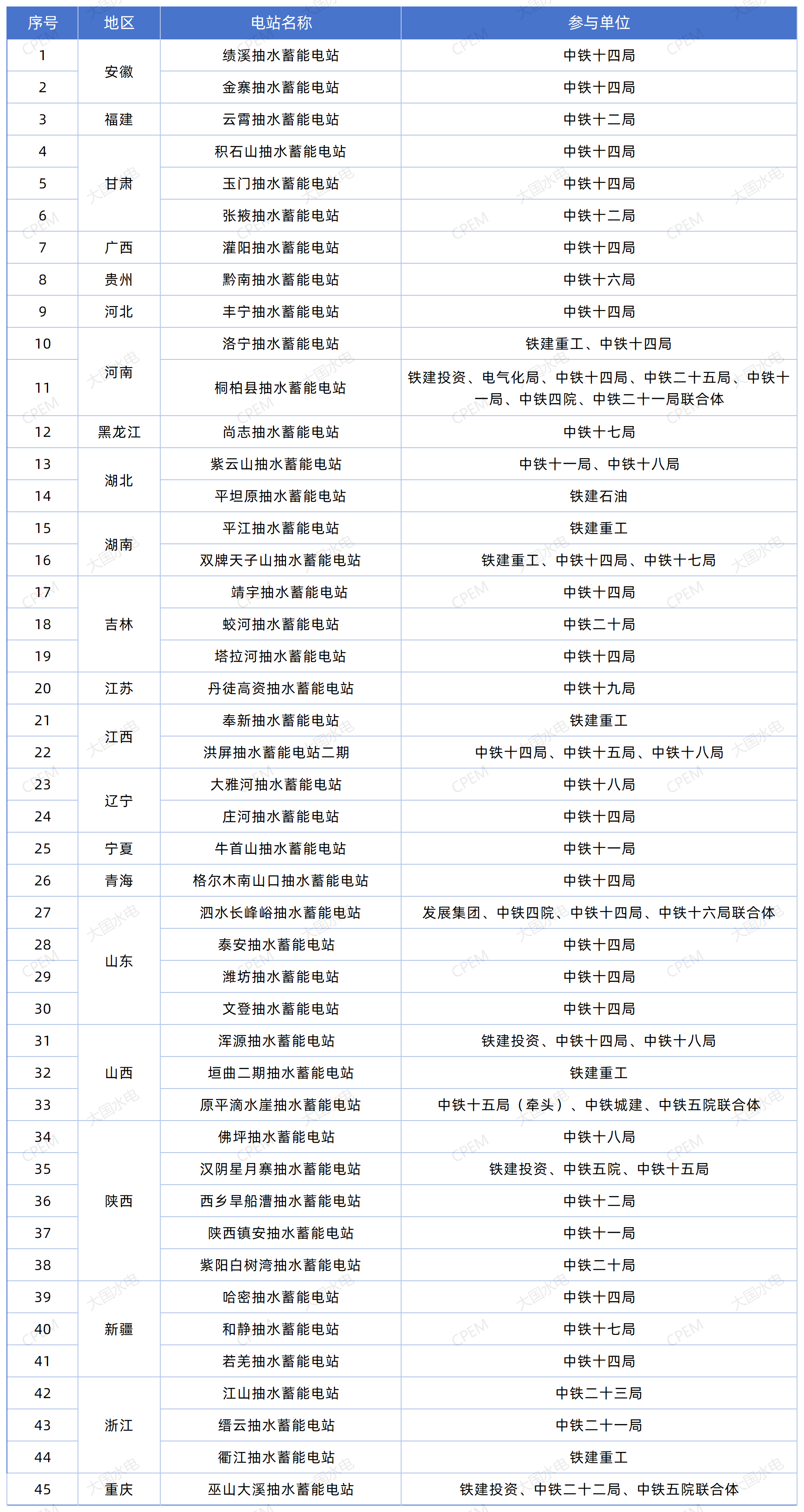 2023年后,中國(guó)鐵建在抽水蓄能領(lǐng)域進(jìn)入快速發(fā)展期,參與多個(gè)國(guó)家級(jí)重點(diǎn)工程。據(jù)CPEM、大國(guó)水電不完全統(tǒng)計(jì),中國(guó)鐵建參與的抽水蓄能項(xiàng)目遍布了全國(guó)20多個(gè)省份,總計(jì)約45個(gè),如下: