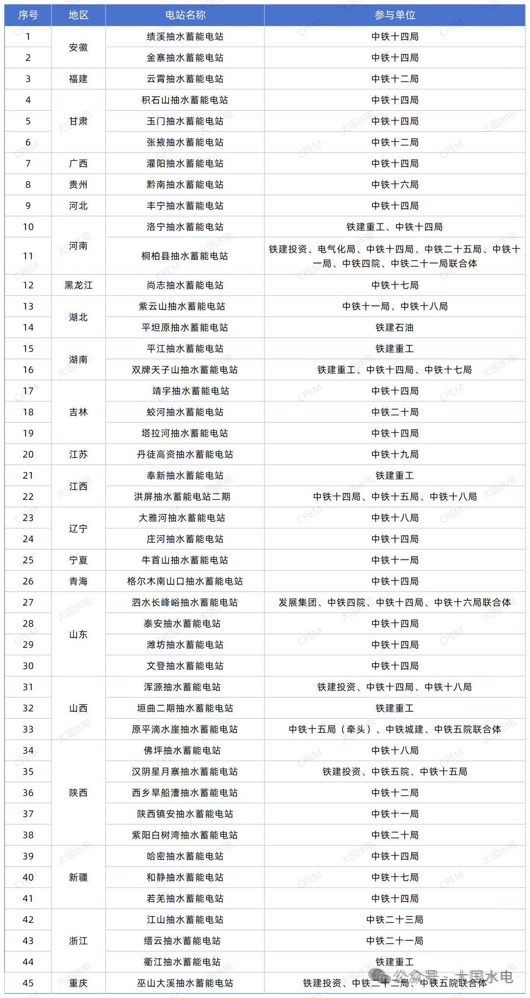 據CPEM大國水電不完全統計,中國鐵建參與的抽水蓄能項目遍布了全國20多個省份,總計約45個,如下:
