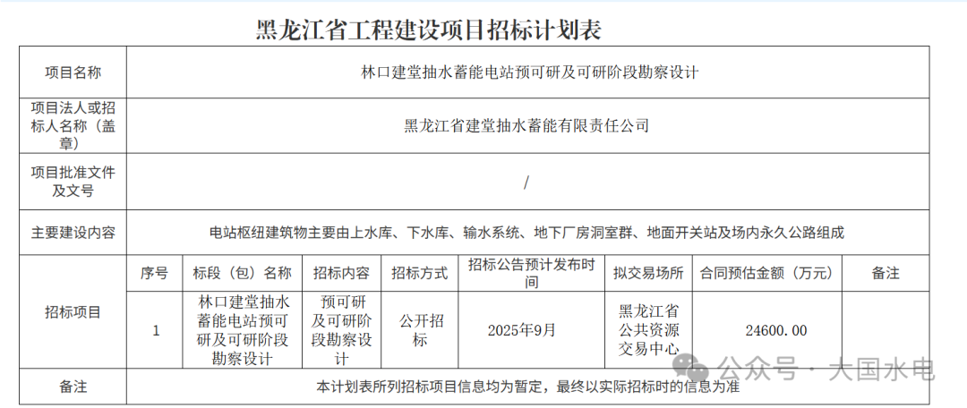2025年9月11日,黑龍江省建堂抽水蓄能有限責(zé)任公司正式發(fā)布林口建堂抽水蓄能電站預(yù)可行性研究與可行性研究階段的勘察設(shè)計招標(biāo)公告。該項目合同最高投標(biāo)限價為24600萬元,標(biāo)志著這一總投資約120億元、規(guī)劃裝機容量180萬千瓦的重大能源工程進入實質(zhì)性推進階段。