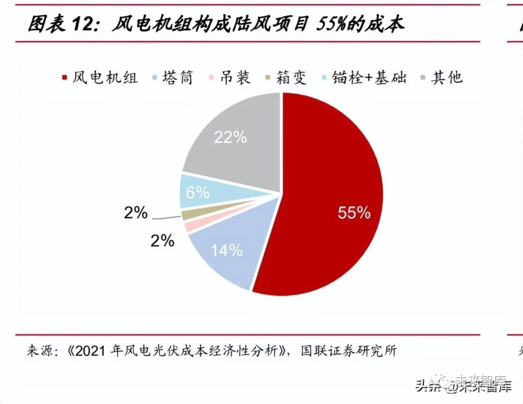 整機制造維度:降低單位制造成本。風機是風電項目最核心的成本組成,根據明 陽智能披露,風機構成我國海上風電項目 38%的成本。以金風科技和三一重能為例, 金風科技 3~4MW 的風機成本降至 2500 元/kW 附近,較 1.5~2MW 的風機平臺在功 率提升一倍后單位成本降幅約 25%。三一重能 4MW 和 5MW 風機成本已經分別降 至 1800 元/kW 和 1600 元/kW,與 2MW 和 2.5MW 的風機平臺相比,功率提升一倍, 單位成本降幅達 30-40%。