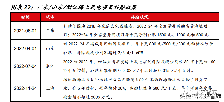 2014-2021 年,海上風電建設享有國家補貼,沿海地區含稅燃煤電價為 0.37- 0.46 元/度電,而海上風電近海項目補貼后的上網電價在 0.75-0.85 元/度電,高額補貼過去助推了我國海上風電快速發展。2022 年起國家補貼退坡,開發商建設意 愿減弱。我們認為國補退出后,我國海上風電主要通過 1)產業鏈降本;2)地方 補貼支持實現平價并提升項目性價比。